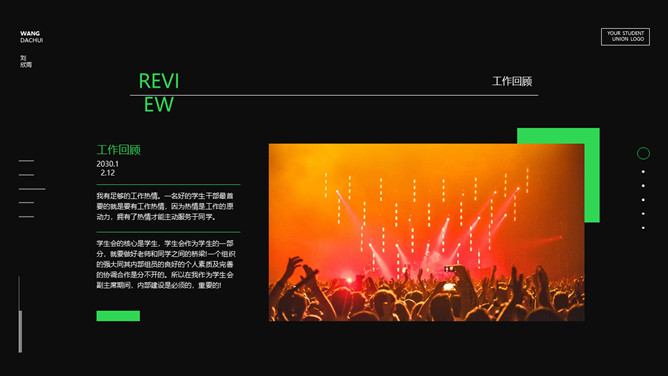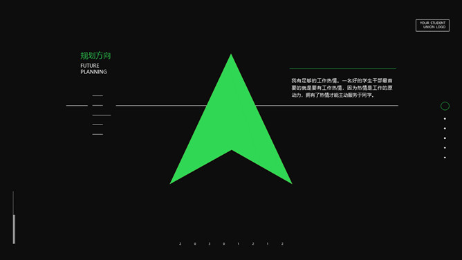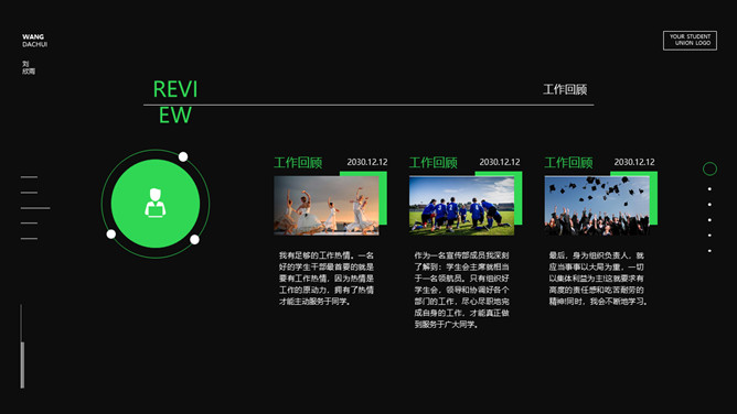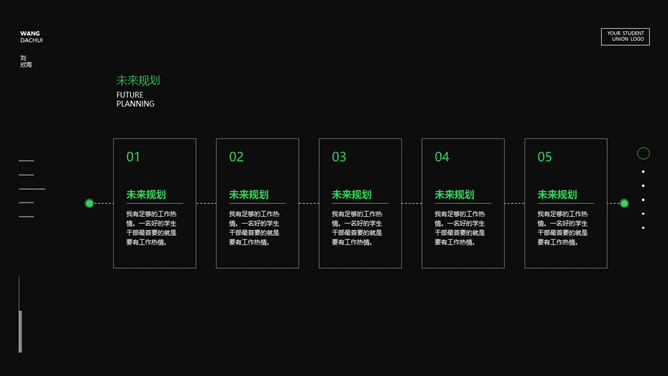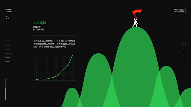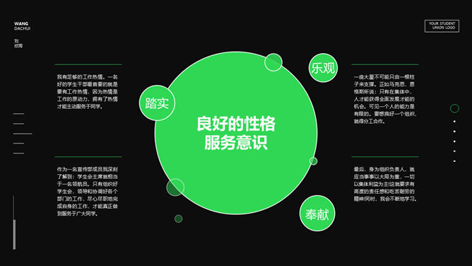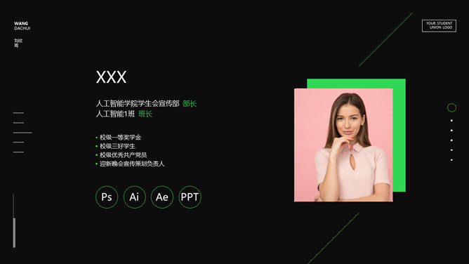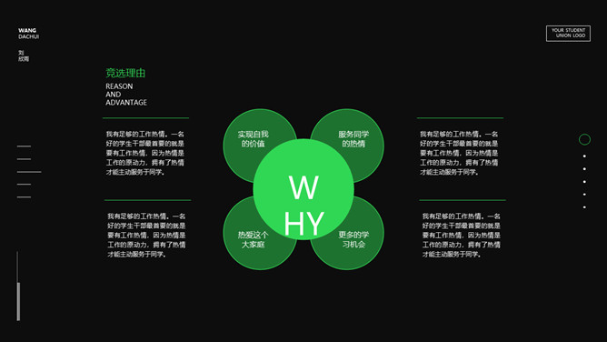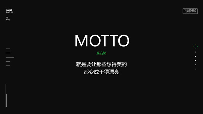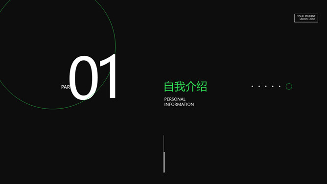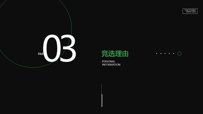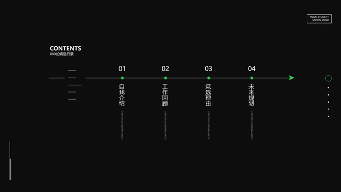 学生会竞选毛遂自荐PPT模板。一套大学生学生会干部竞选幻灯片模板,极简设计,时尚黑绿配色,动态播放效果。
