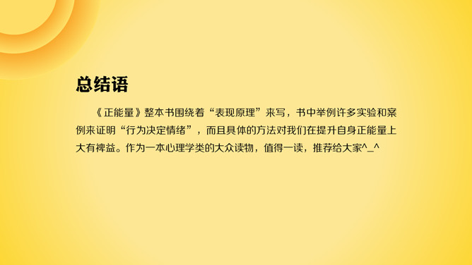 《正能量》读书笔记PPT。快乐是可以被创造的,不仅仅是浅笑,舞蹈、歌唱、积极的说话内容,都可以让身体充溢正能量。换句话说,你想变得快乐,那就先变得美好,这样才有吸引美好事物的能量。