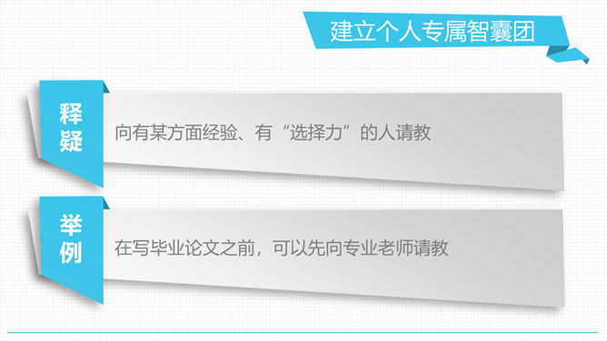 《麦肯锡教我的思考武器》PPT读书笔记。从逻辑思考到解决问题。树立个人专属智囊团,向有某方面经验、有“挑选力”的人请教,在写毕业论文之前,可以先向专业教师请教。