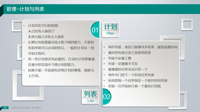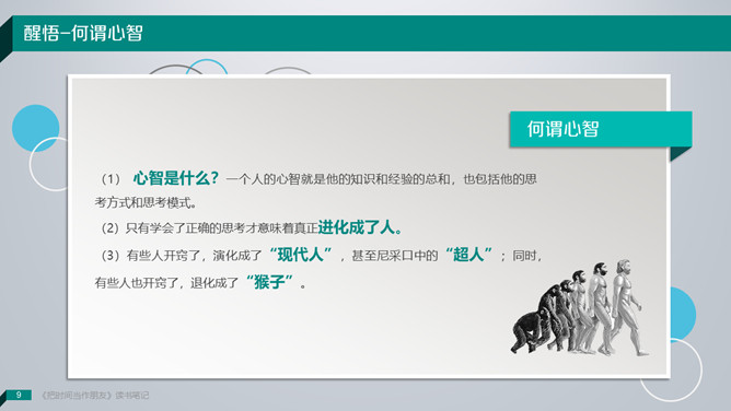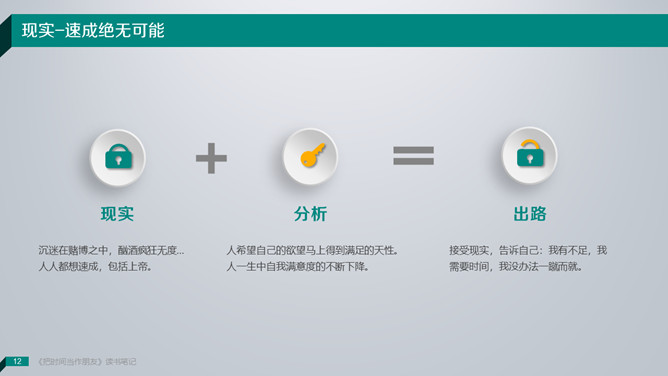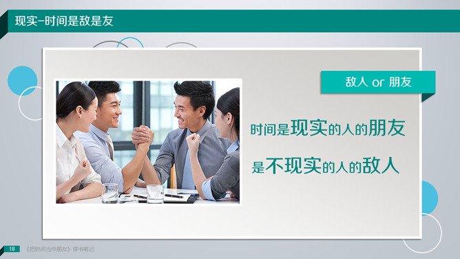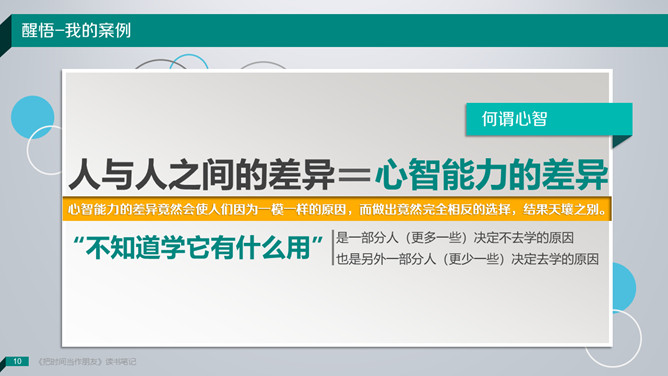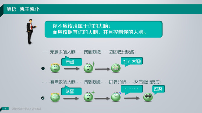 《把时间当做朋友》读书笔记PPT。敞开心智,办理人生。咱们无法办理时间,咱们真实能够办理的是:——咱们自己。解决方案只有一个:全部靠积累!你不应该隶属于你的大脑;而应该具有你的大脑,并且控制你的大脑。