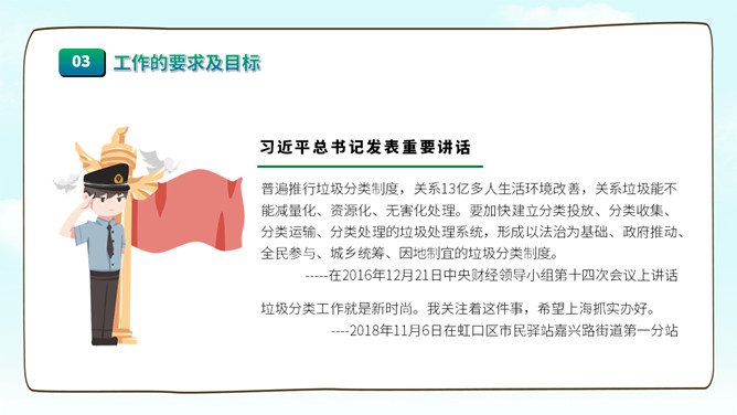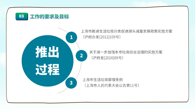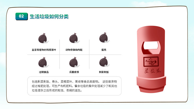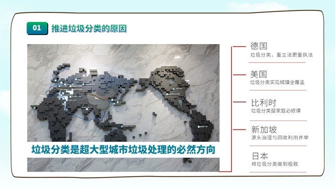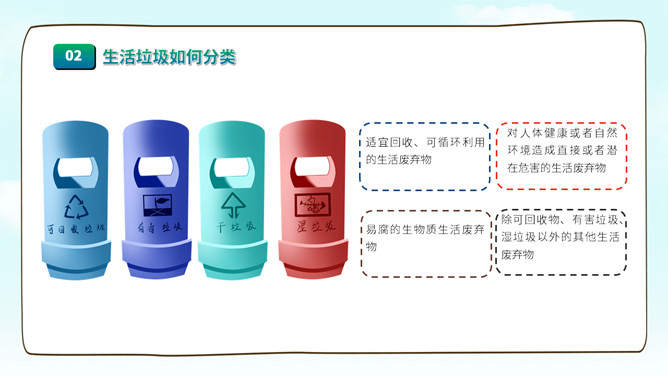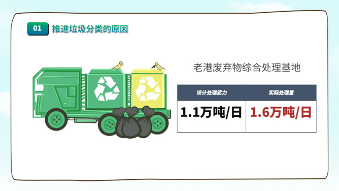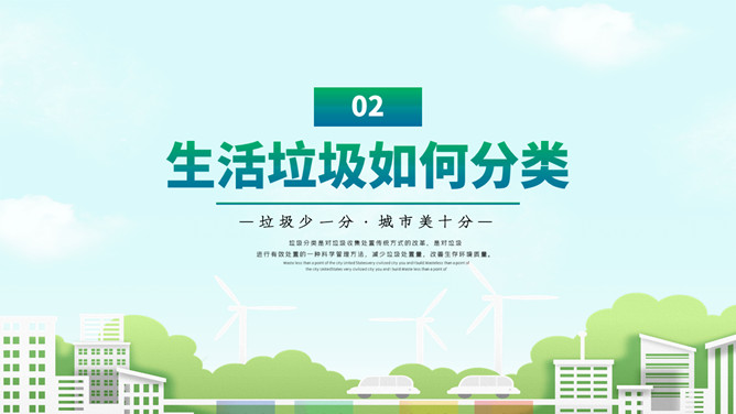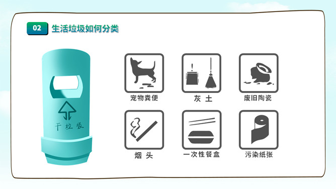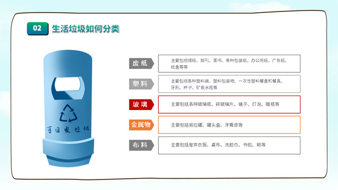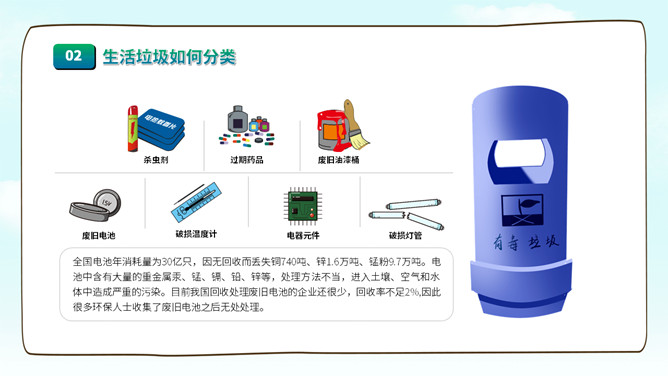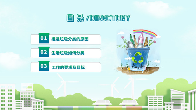 废物分类常识宣传PPT模板。一套废物分类常识介绍宣传幻灯片模板,圾分类的原因、废物如何分类、要求及目标。
