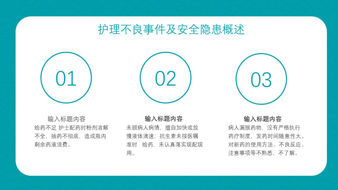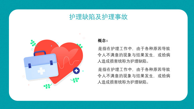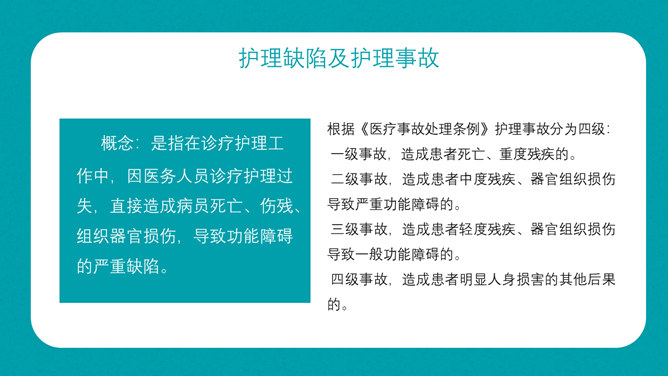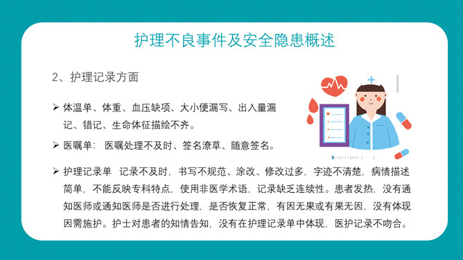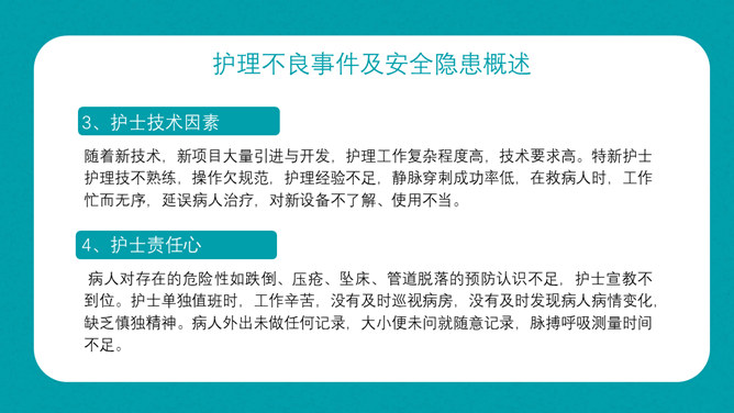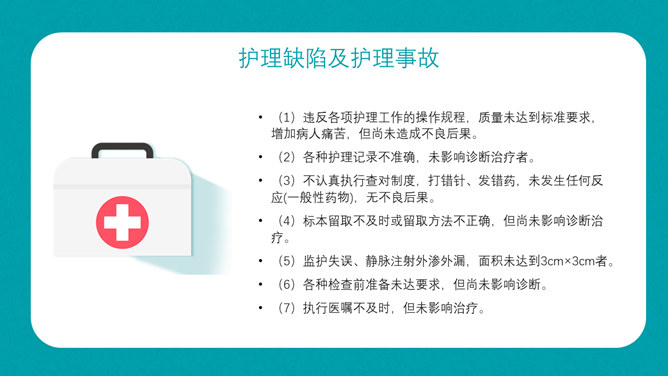 护理不良事情隐患缺陷PPT模板。护理不良事情及安全隐患概述、护理缺陷及护理事端、案例剖析启示、防范对策。