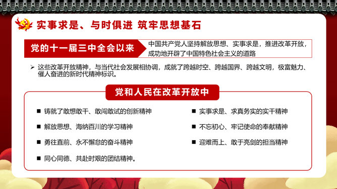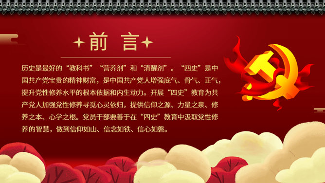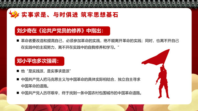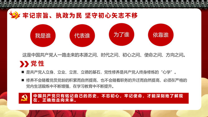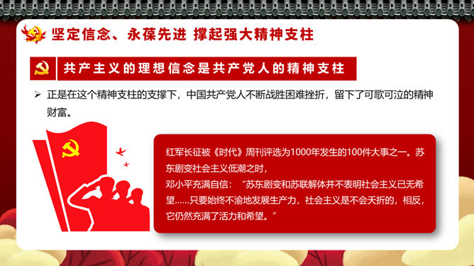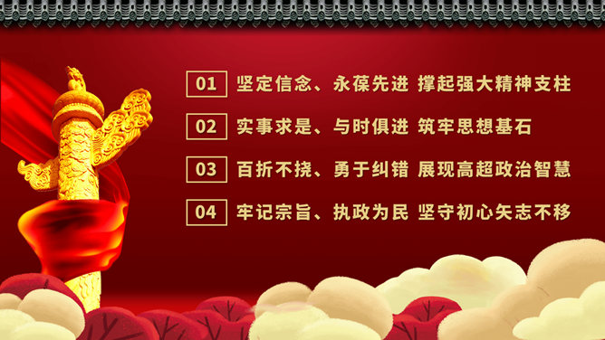 四史教育罗致党性修养PPT模板。坚定信念、永葆先进,撑起强壮精神支柱。脚踏实地、与时俱进,筑牢思维基石。坚韧不拔、勇于纠错,展现高明政治智慧。牢记主旨、执政为民,据守初心矢志不移。