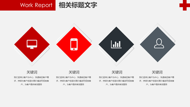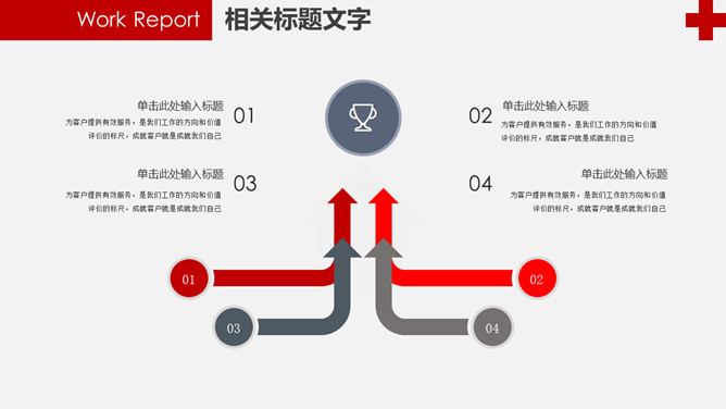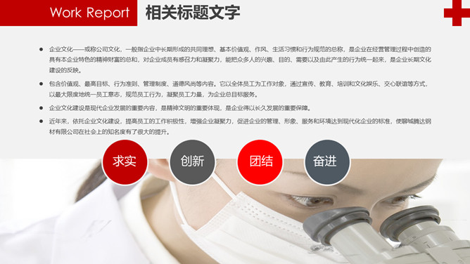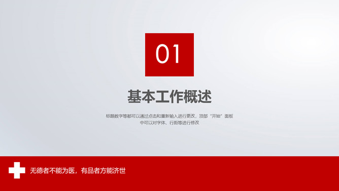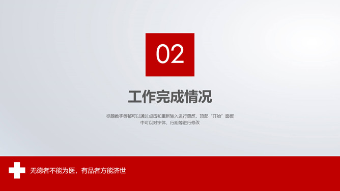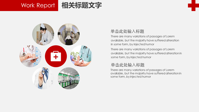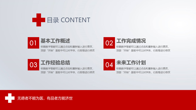 红十字医疗医院工作报告PPT模板。一套医疗卫生医院医师工作总结报告幻灯片模板,赤色主色调,红十字元素装饰。