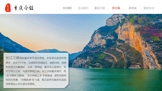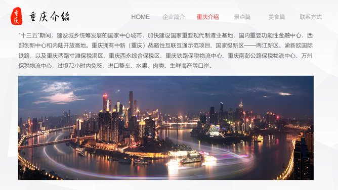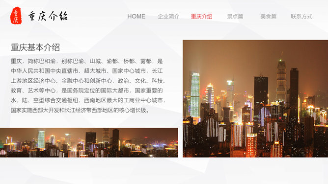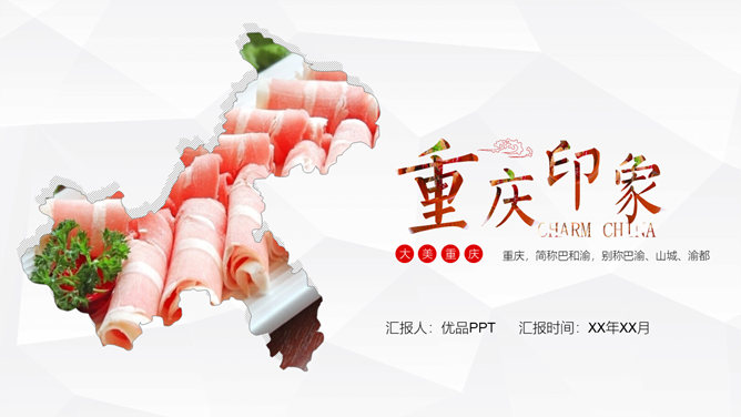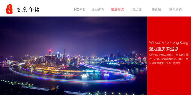 重庆景点美食旅行攻略PPT模板。一套重庆旅行旅行攻略幻灯片模板,介绍了重庆的著名景点和各种美食。
