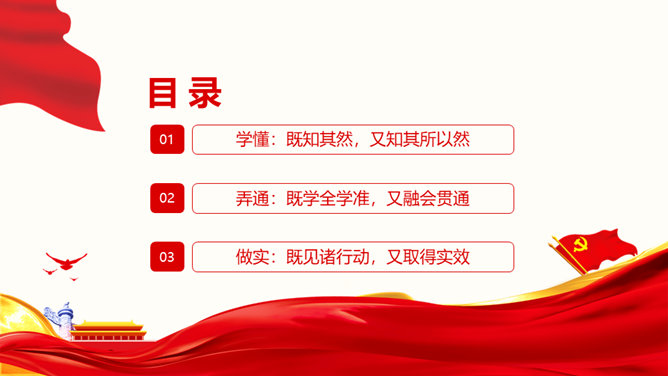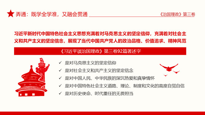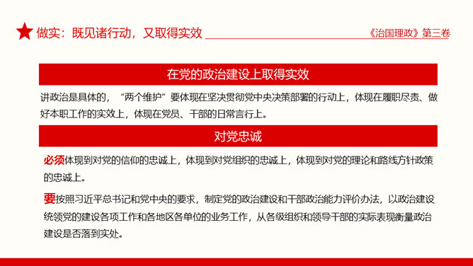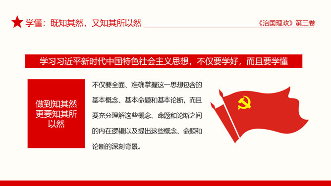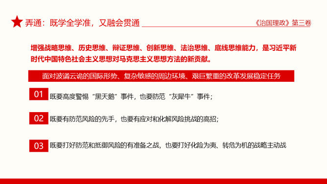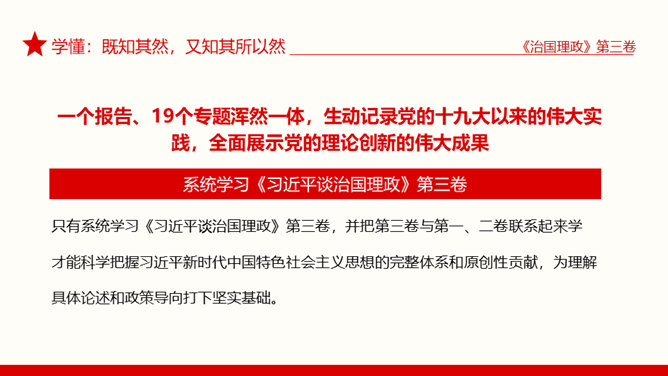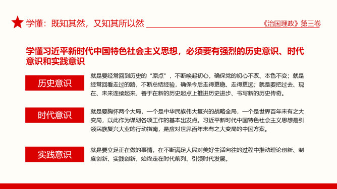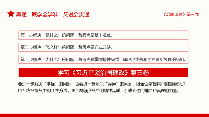 治国理政第三卷学懂弄通做实PPT模板。治国理政第三卷在学懂弄通做实上下真功夫。学懂:既知其然,又知其所以然。弄通:既学全学准,又融会贯通。做实:既见诸行动,又取得实效。