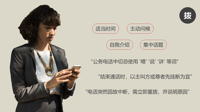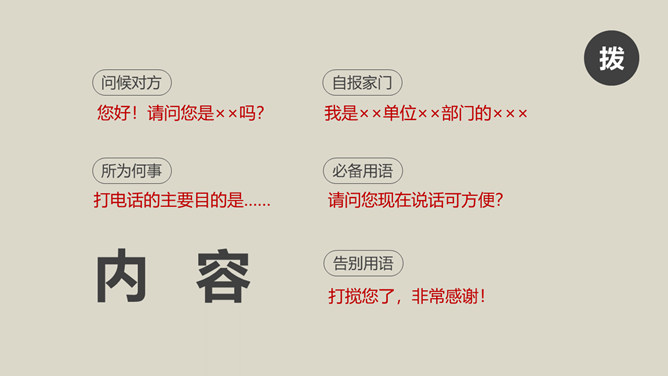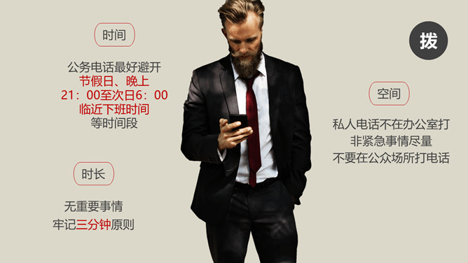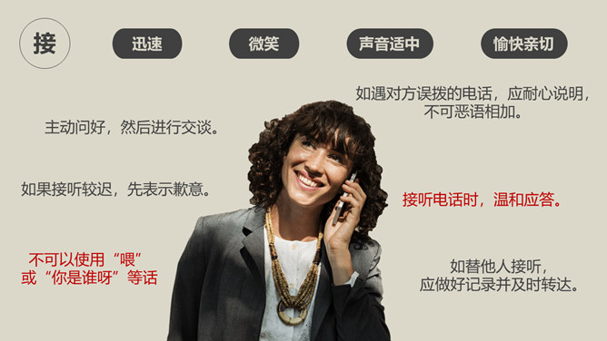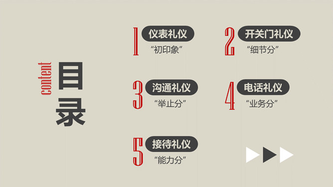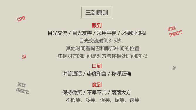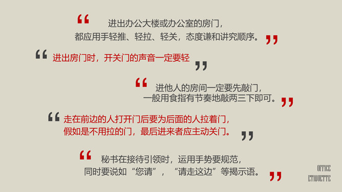 办公室礼仪训练PPT课件模板。包括仪表礼仪、开关门礼仪、交流礼仪、电话礼仪、招待礼仪几个部分。