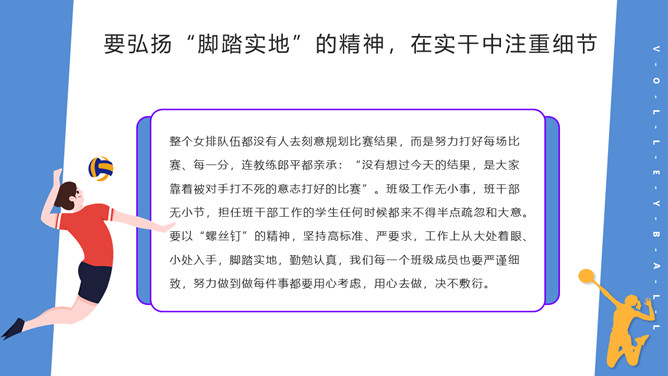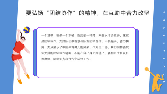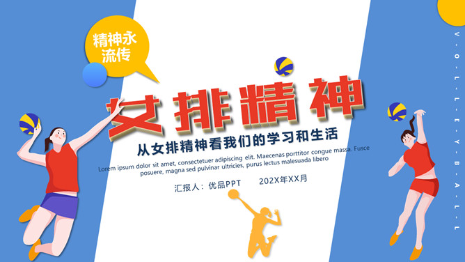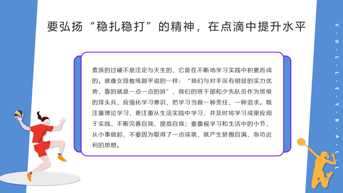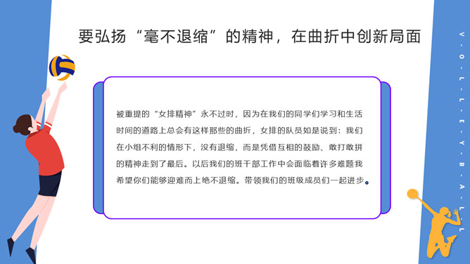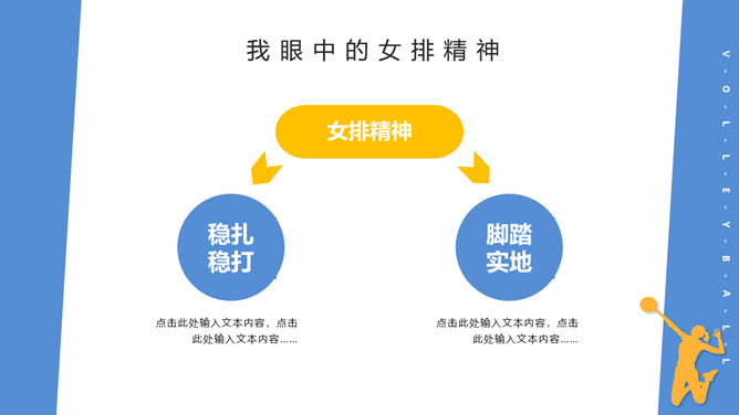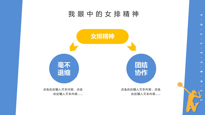排球运动女排精神PPT模板。一套排球运动主题幻灯片模板,精约规划,合适排球介绍、教育课件等用途。