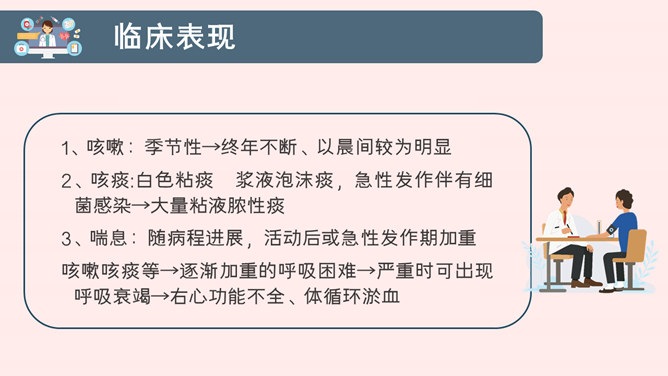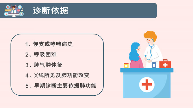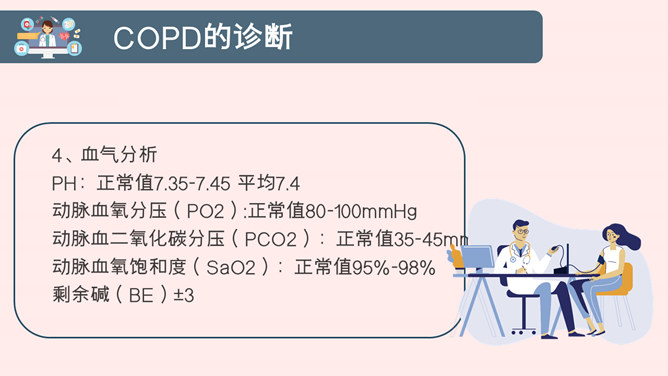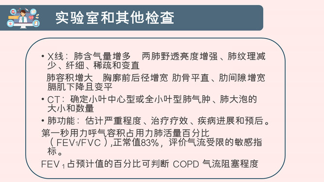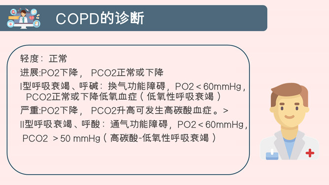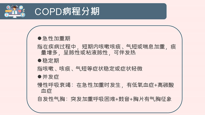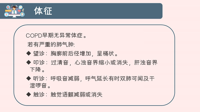 COPD患者护理查房PPT模板。包括相关知识介绍、扼要病史、护理确诊与办法、健康教育四个部分。