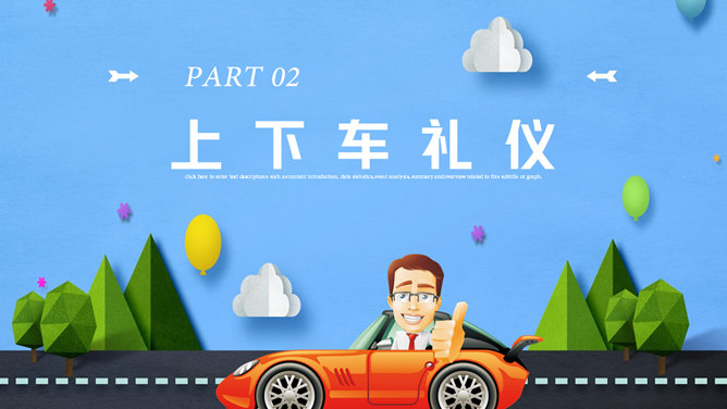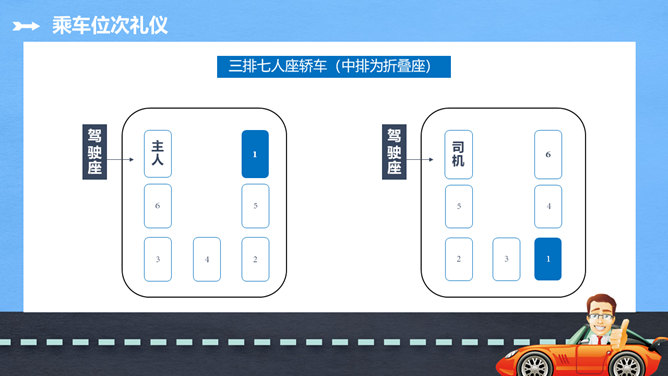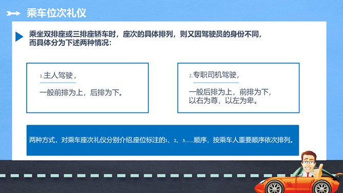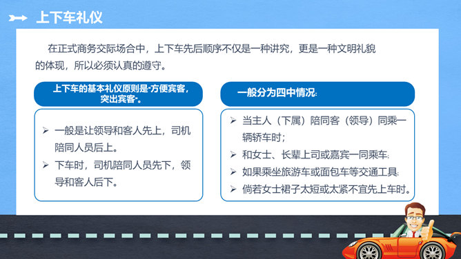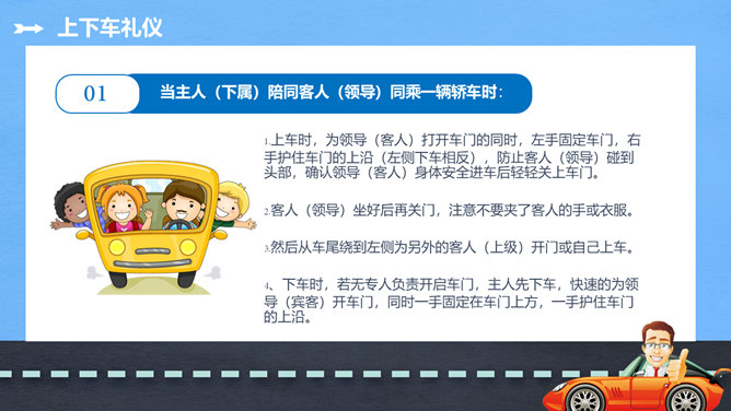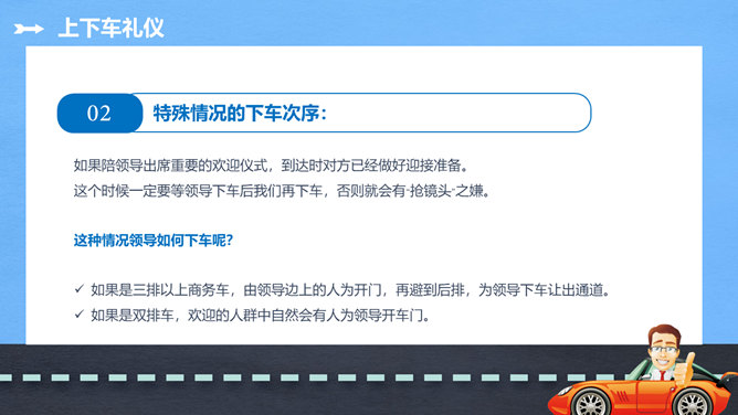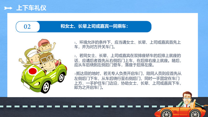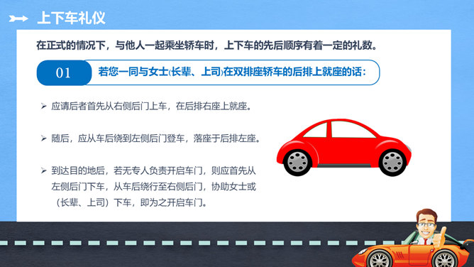 商务礼仪搭车礼仪训练PPT模板。商务社交搭车位次座次礼仪、上下车礼仪、搭车注意事项。