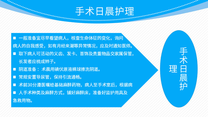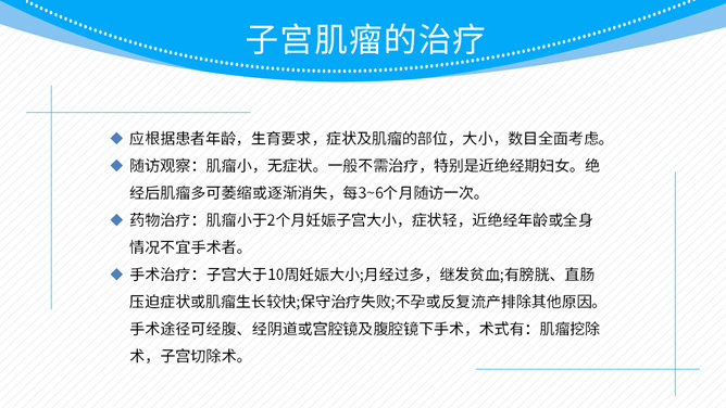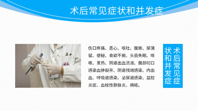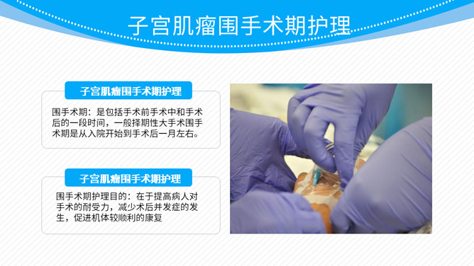 子宫肌瘤围手术期护理PPT模板。包括临床表现、术前术后护理 、病情观察三个部分。