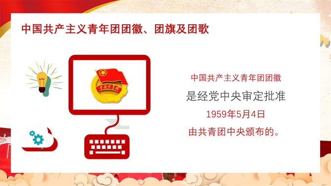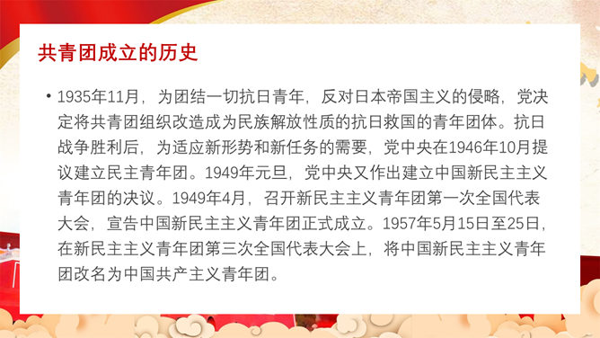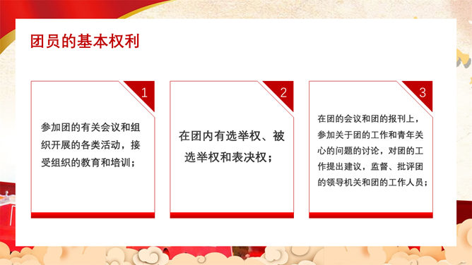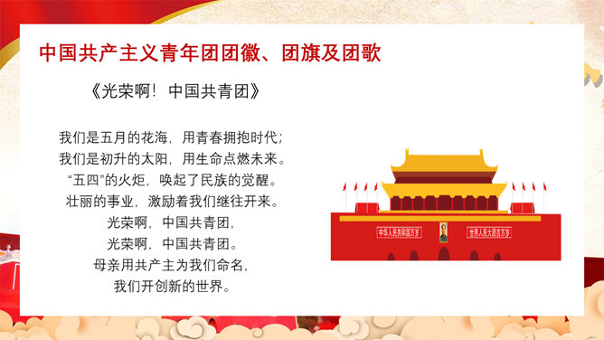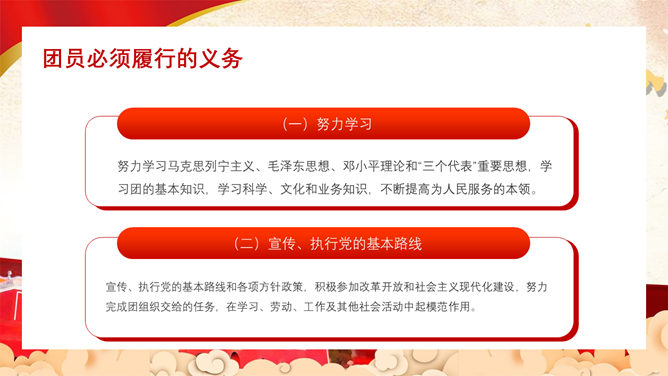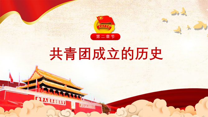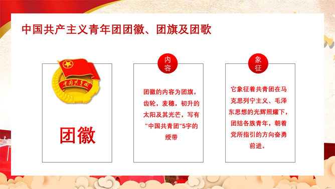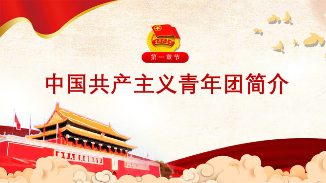 共青团团员入团教育PPT模板。内容包括中国共产主义青年团简介,共青团成立的前史,中国共产主义青年团团徽、团旗及团歌,团员有必要履行的义务,团员的基本权利,新团员入团程序,共青团入团誓词,我们的前史使命。