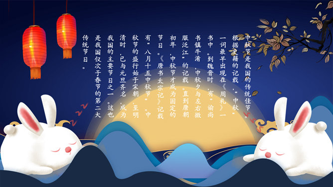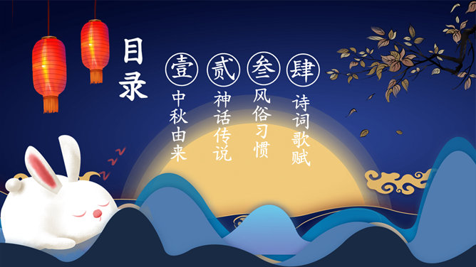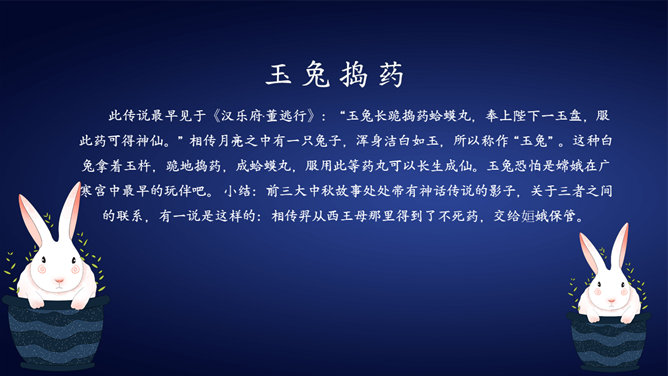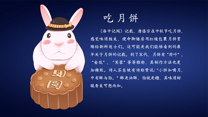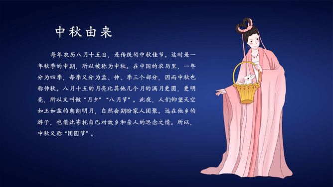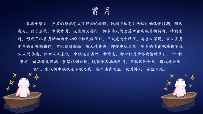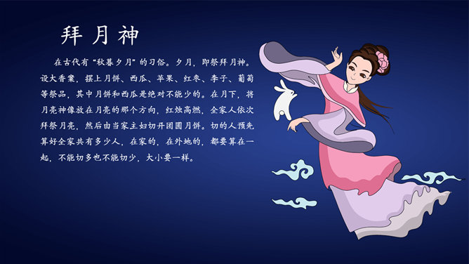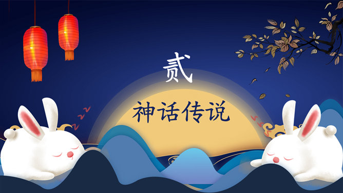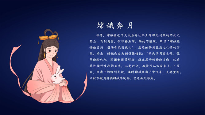 中秋节主题班会PPT模板。一套传统佳节中秋节班会主题幻灯片模板,可爱卡通风格,包括中秋由来、神话传说、风俗习惯、诗词歌赋几部分。