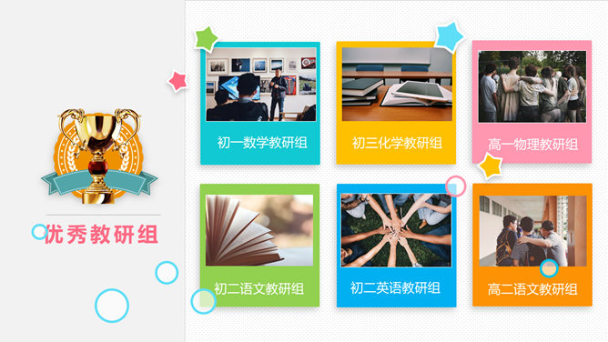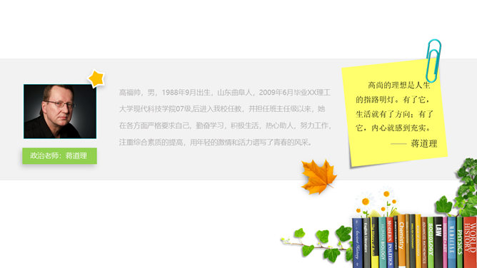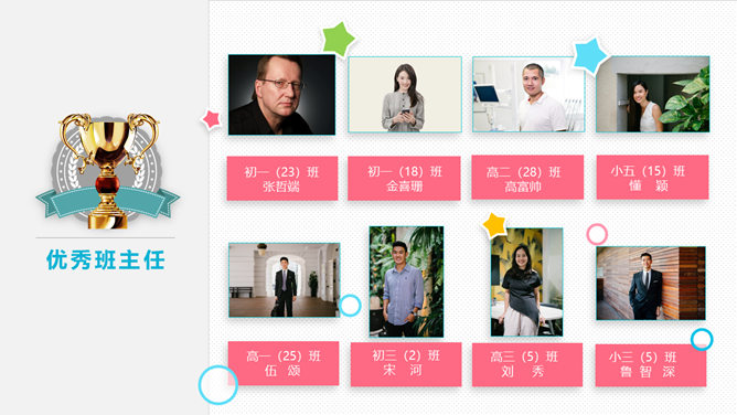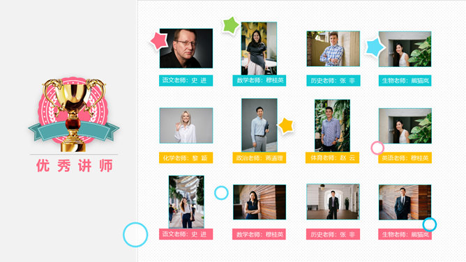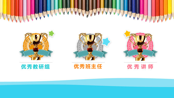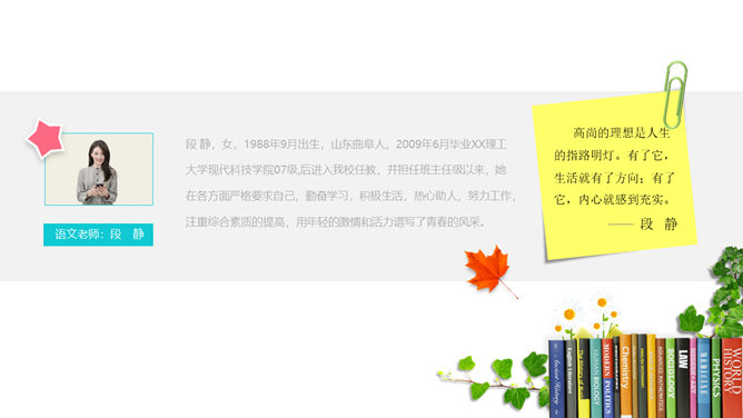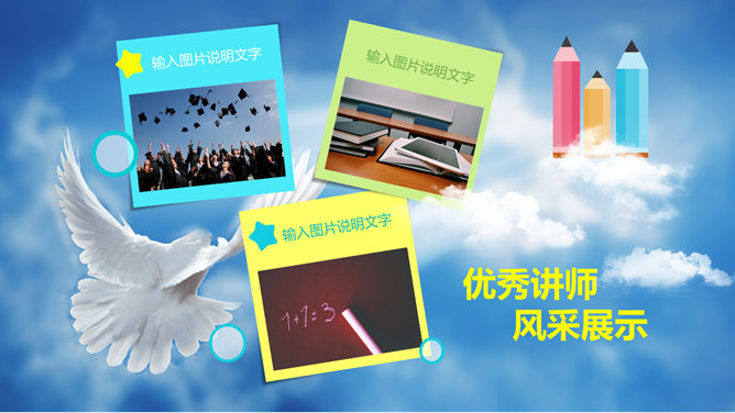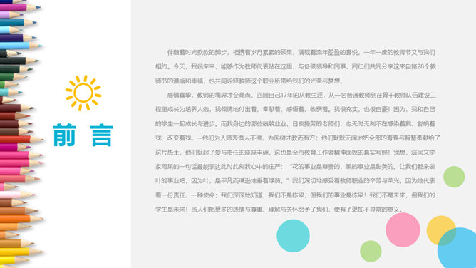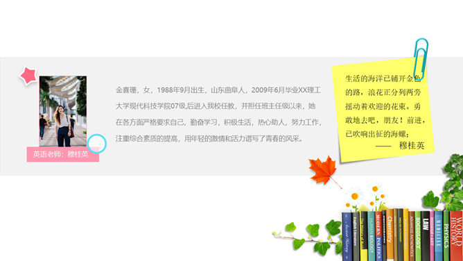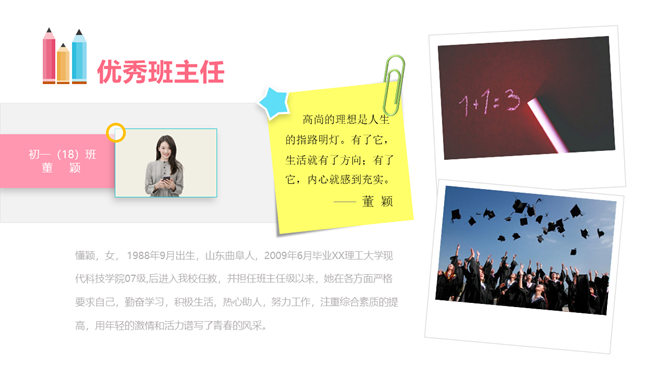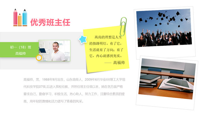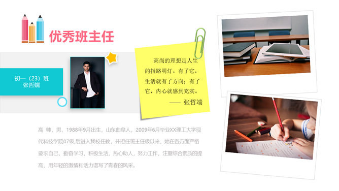 学校教师风貌展现PPT模板。一套学校教师展现幻灯片模板,多图文排版也没,铅笔、便签学校元素装饰。
