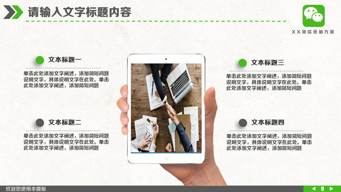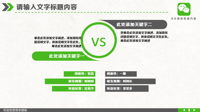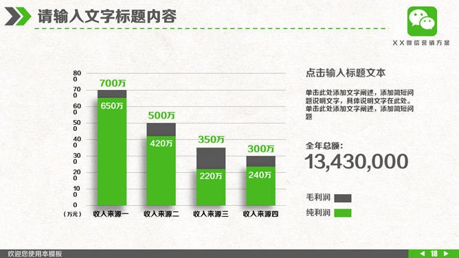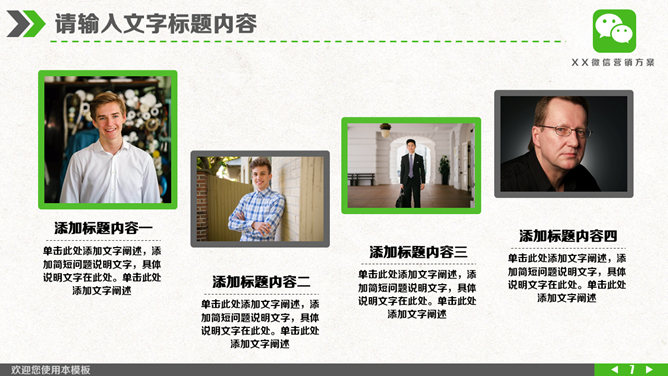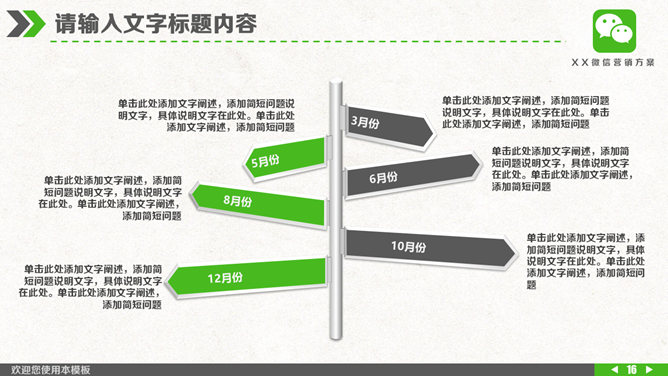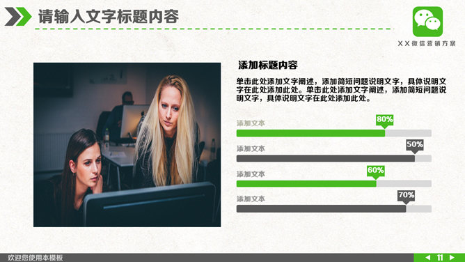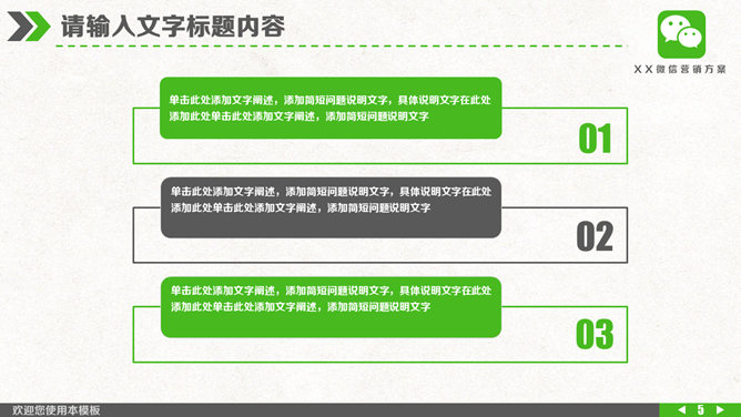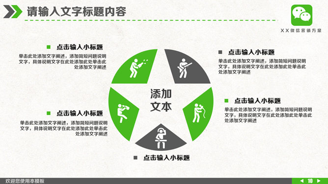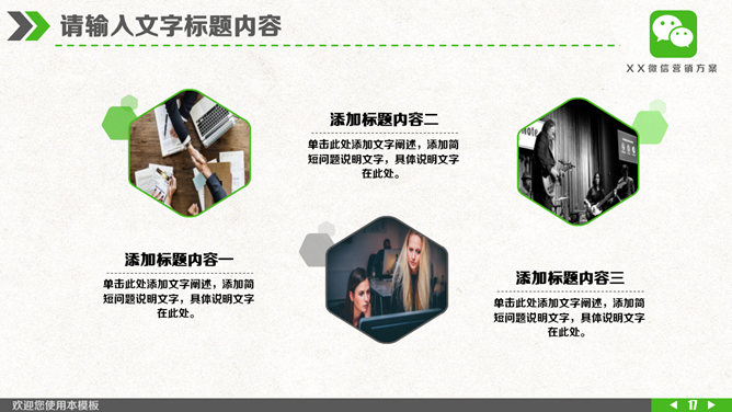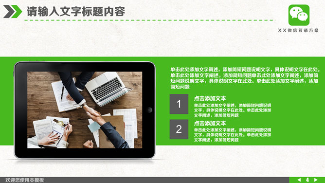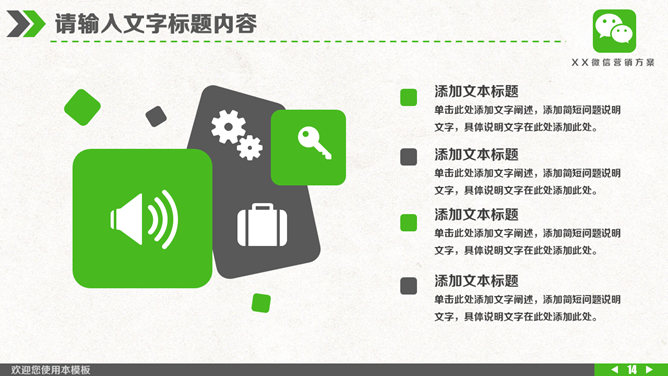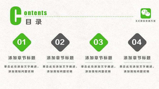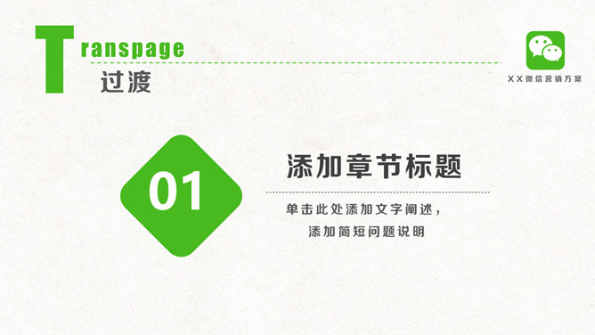 微信营销解决计划PPT模板。一套微信营销计划幻灯片模板,微信主题绿色主色调,页面类型丰富有用。
