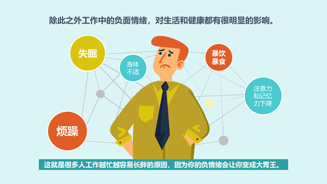别让老板关心你的心情PPT著作。工作中的负面心情从何而来?首先咱们要知道心情是指伴随着认知和意识进程发生的对外界事物态度的体会。所以一旦工作进程带给咱们压力,就会发生负面心情。