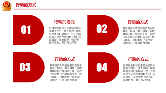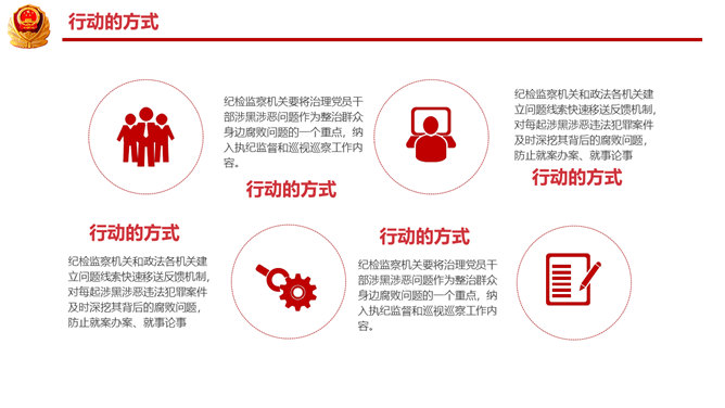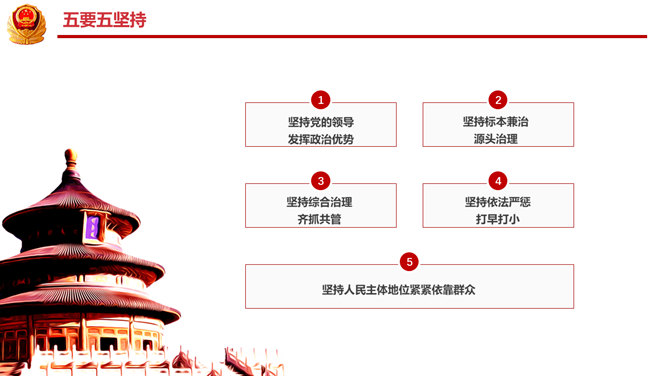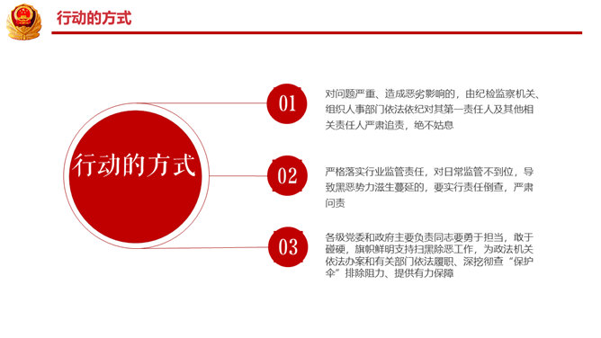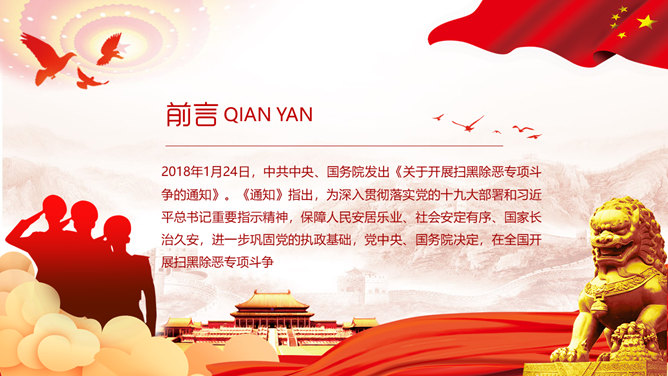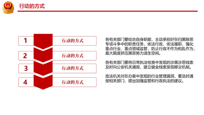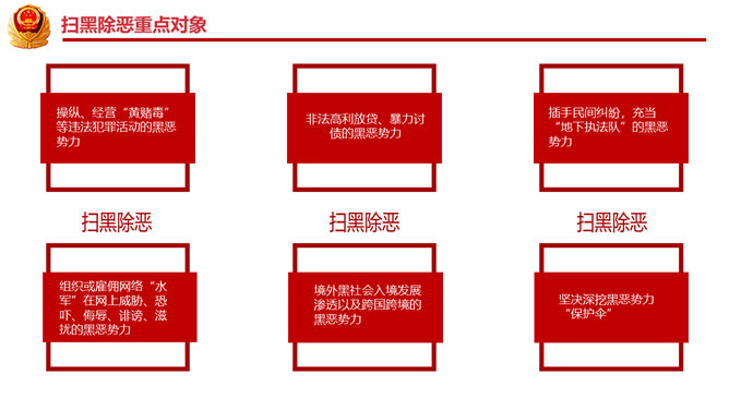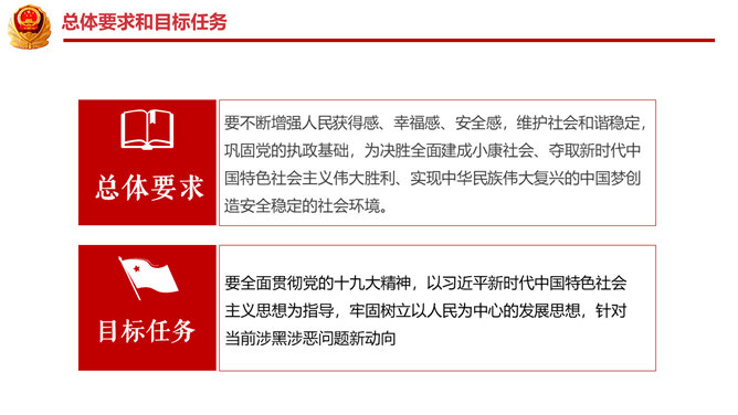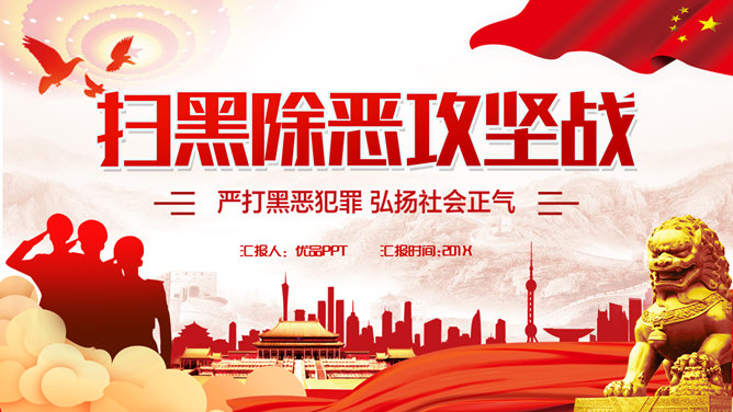 扫黑除恶打击犯罪PPT模板。打赢打黑除恶攻坚战,严打黑恶犯罪,宏扬社会正气,包括整体要求和方针任务、五要五坚持、行动方式、扫黑除恶重点对象。