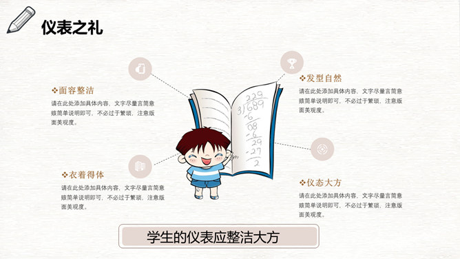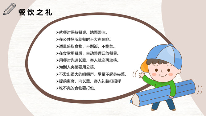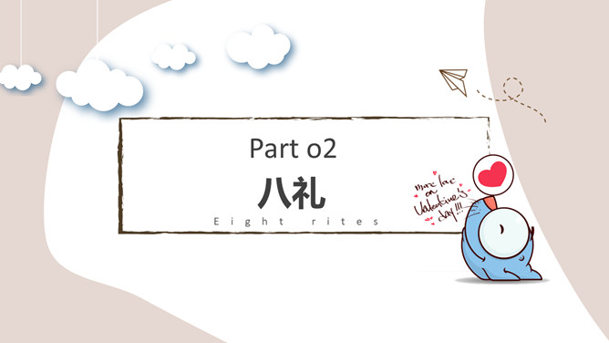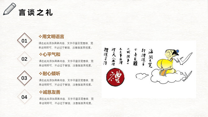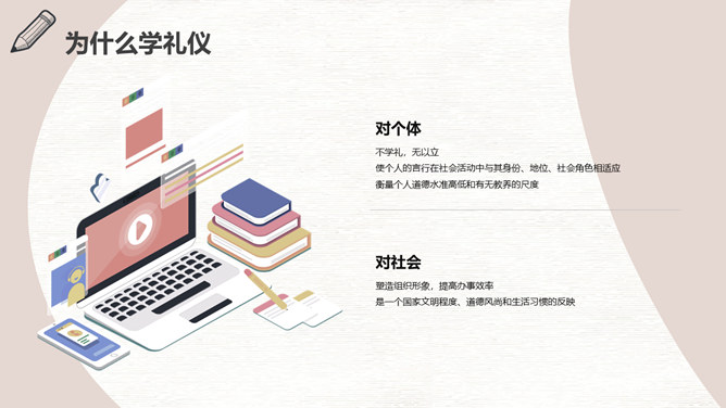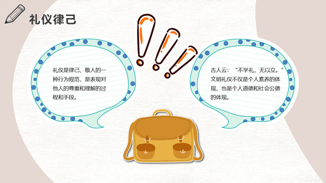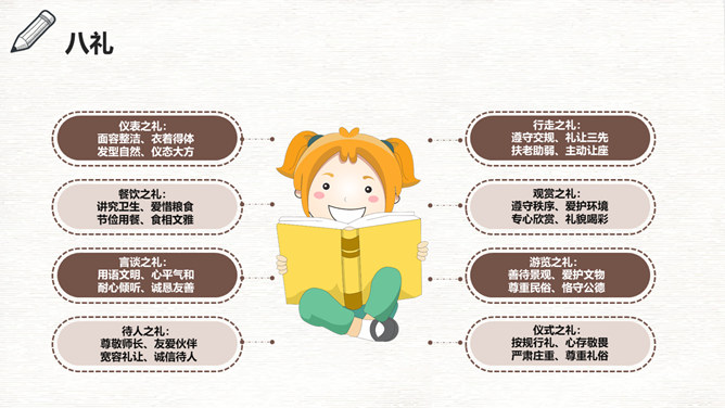 八礼四仪文明礼仪教育班会PPT模板。礼仪是律己、敬人的一种行为规范,是表现对他人的尊重和理解的过程和手段。古人云:“不学礼,无以立。”文明礼仪不仅是个人素质的表现,也是个人道德和社会公德的表现。