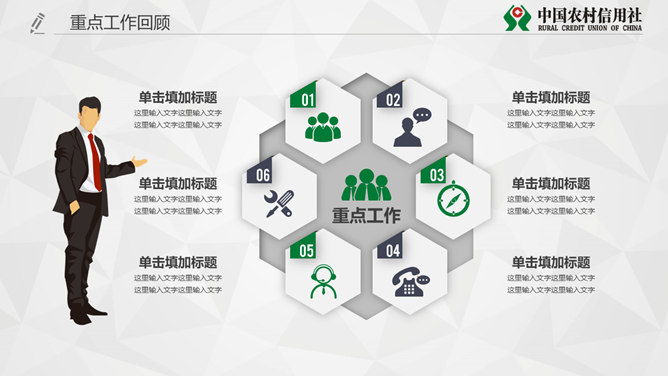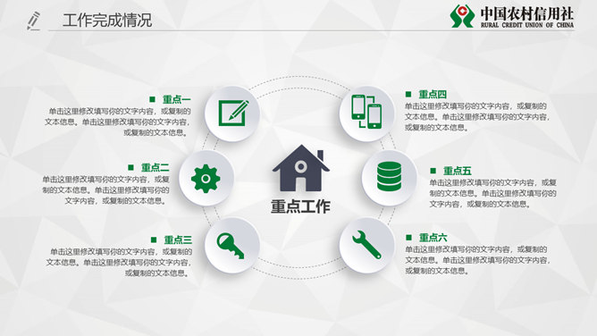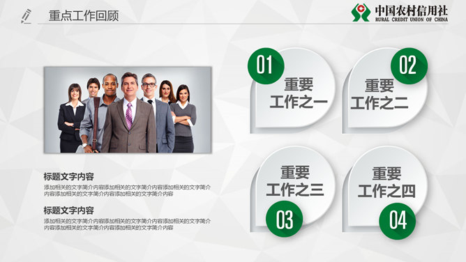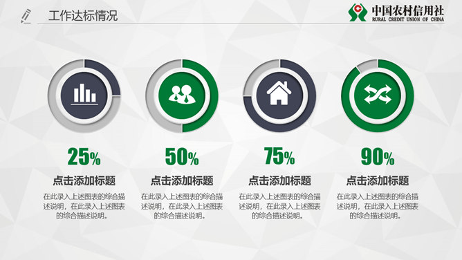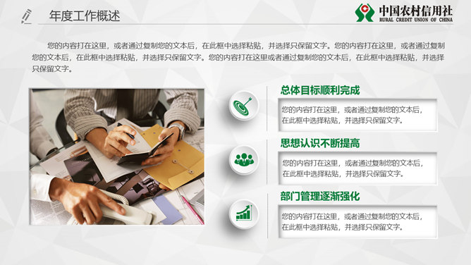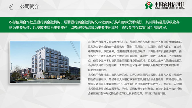 中国农村信用社专用PPT模板。一套农村信用合作社工作汇报总结计划专用幻灯片模板,页面类型丰厚实用。