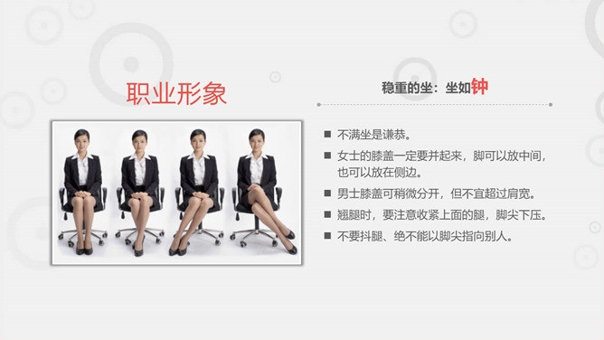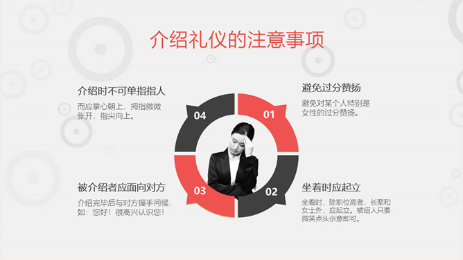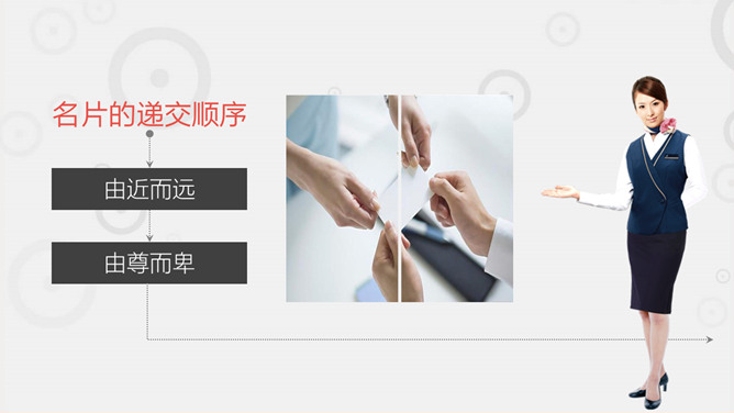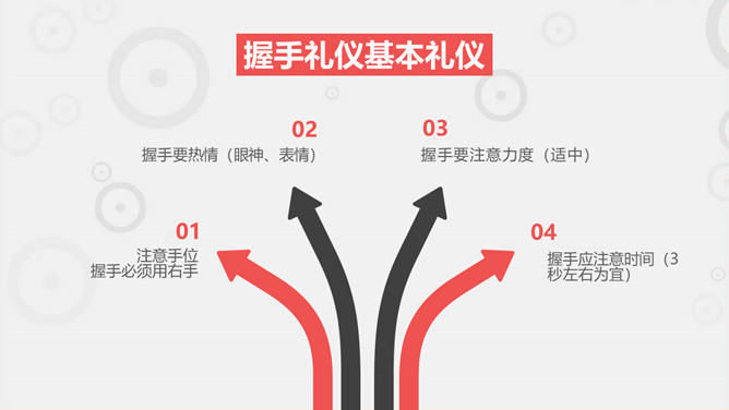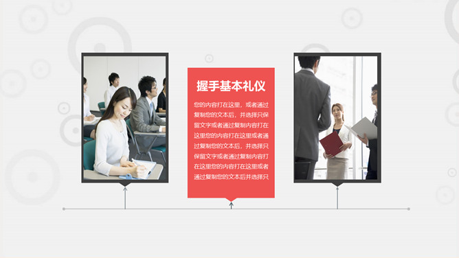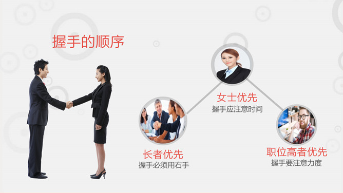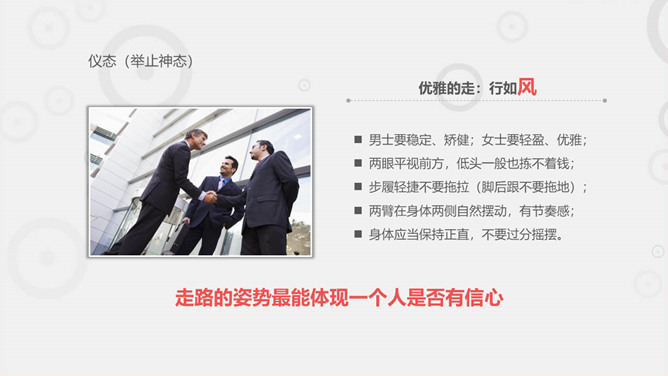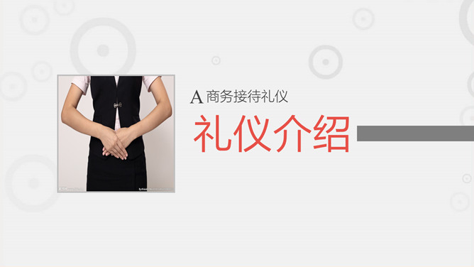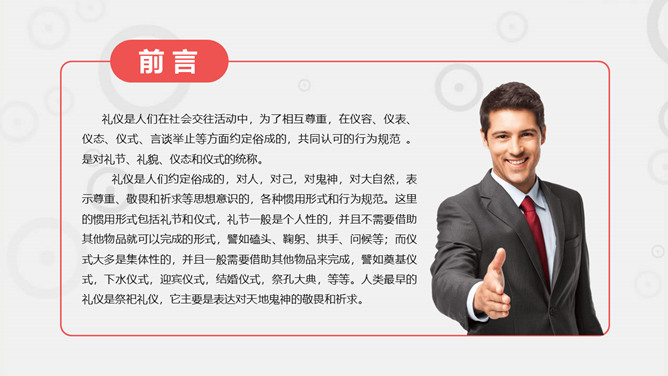 职场职业礼仪训练PPT模板。一套职业礼仪训练课件模板,包括礼仪根本介绍 ,握手迎客礼仪 ,会议访问礼仪,外表仪态礼仪等几个部分。