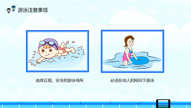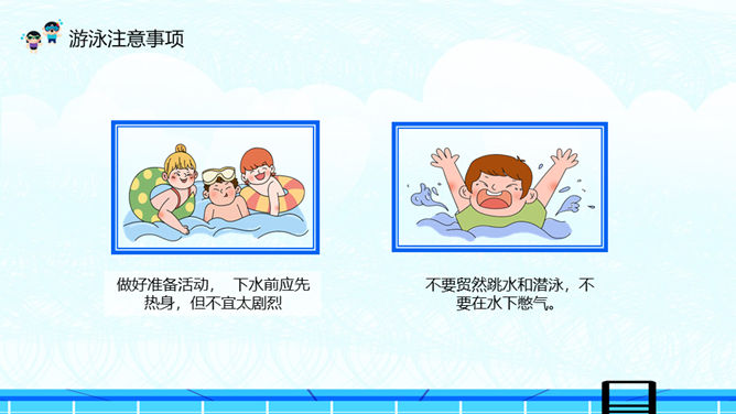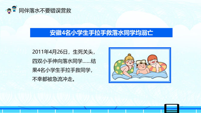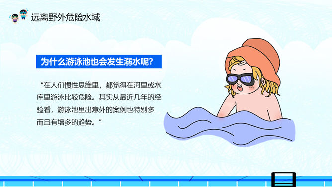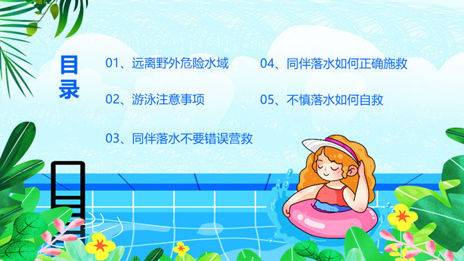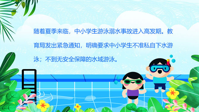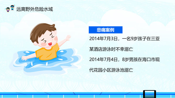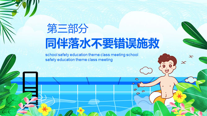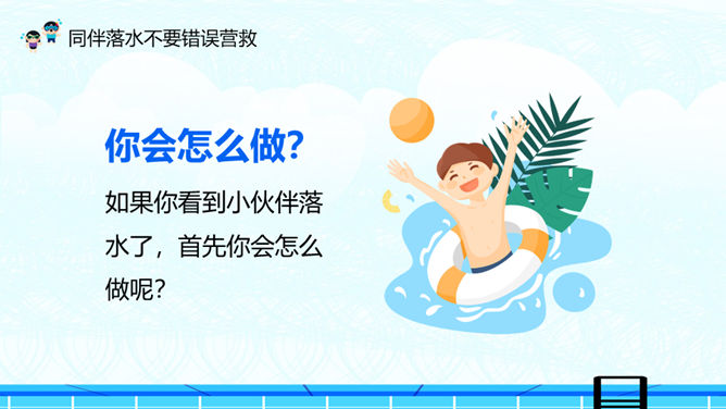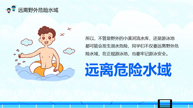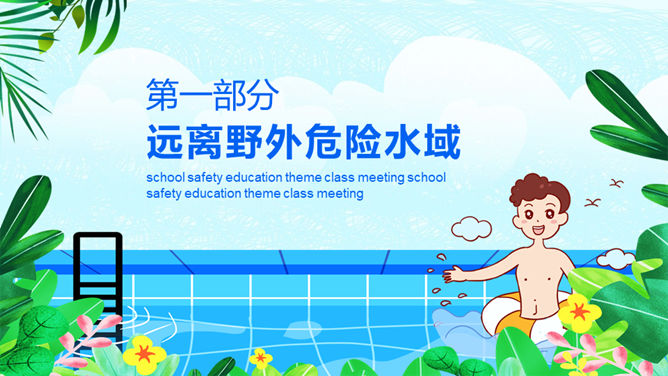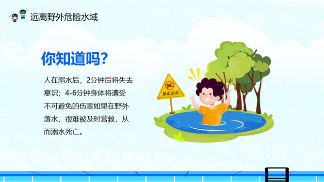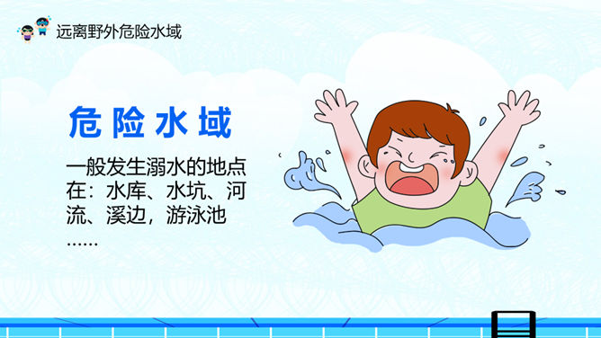 夏日防溺水主题教育班会PPT模板。一套小学初中夏日防溺水事故安全教育主题班会模板,包含远离户外危险水域、游泳注意事项、伙伴落水不要错误营救、伙伴落水怎么正确施救、不小心落水怎么自救几个部分。