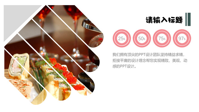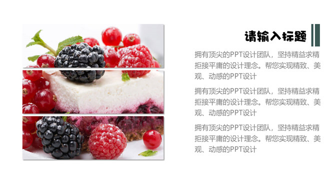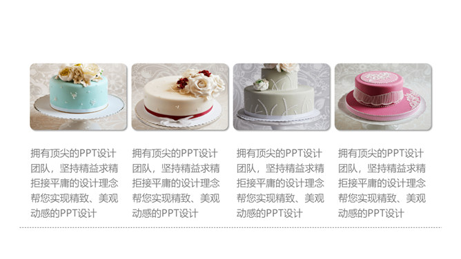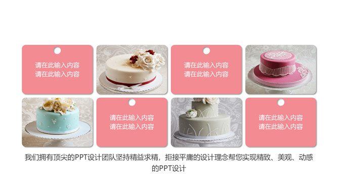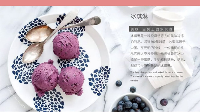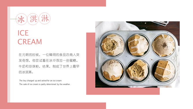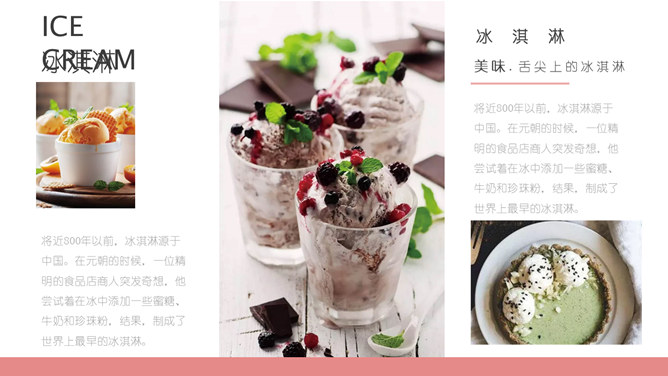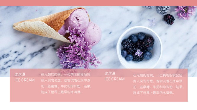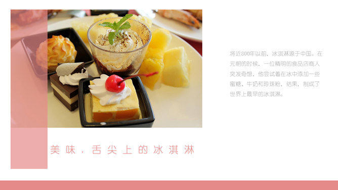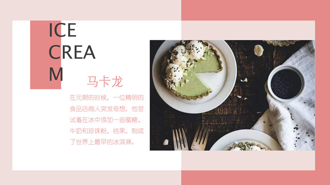 冰淇淋甜品甜点马卡龙PPT模板。一套甜品甜点美食相关模板,温暖粉色主色调,多图文排版页面。