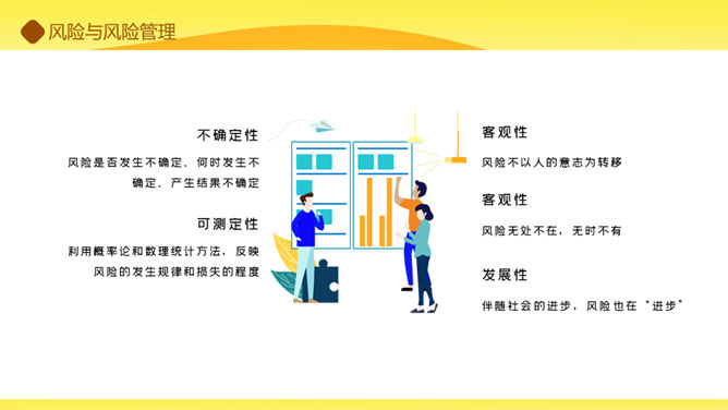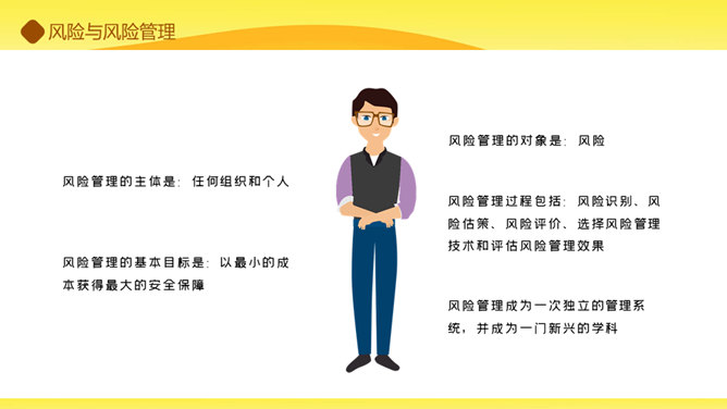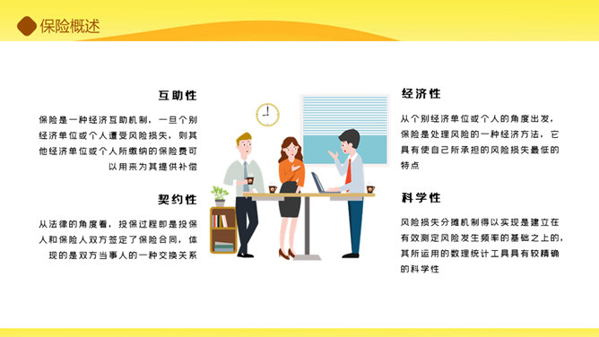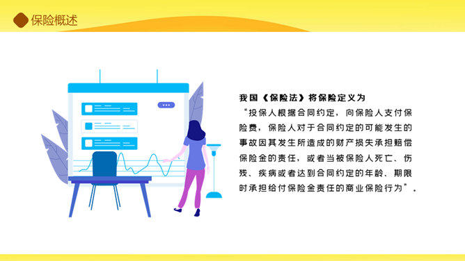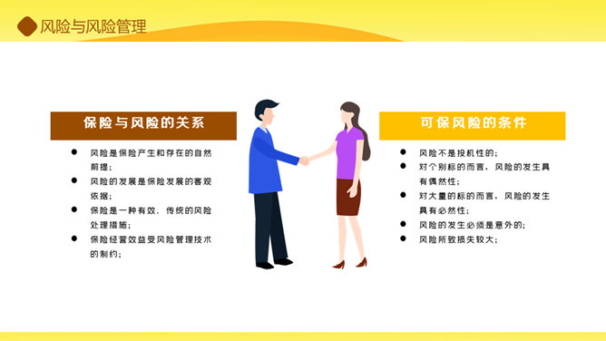 理财保险常识培训PPT模板。一套金融理财、保险常识培训幻灯片模板,包含风险与风险管理、保险概述、保险合同、保险基本原则几个部分。