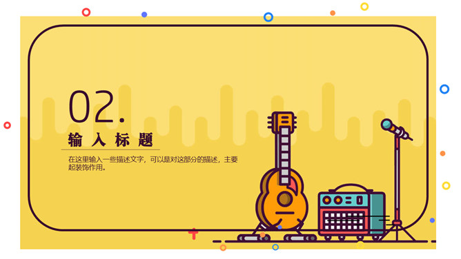 MBE风吉他音乐培训PPT模板。一套音乐主题相关幻灯片模板,吉他话筒音箱背景,清新心爱MBE风格规划。