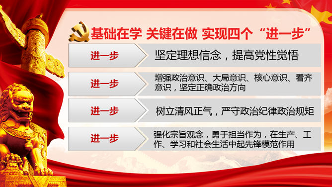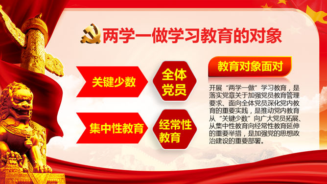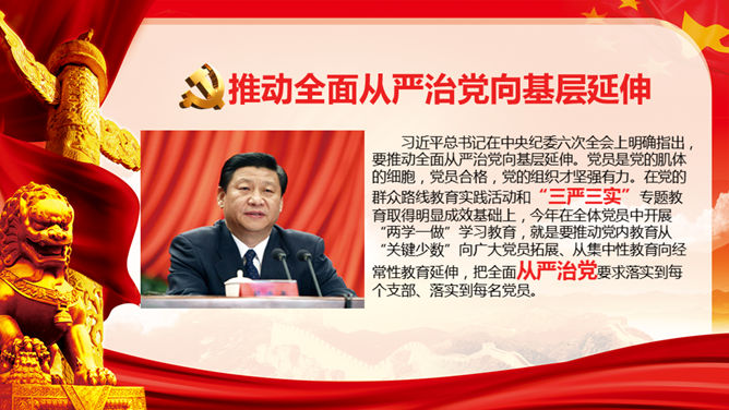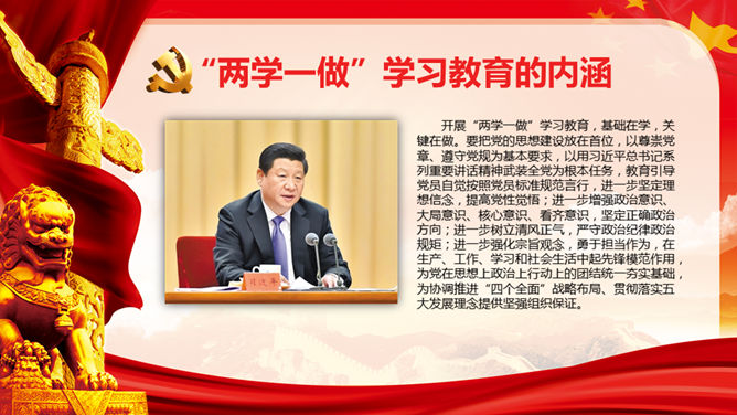 两学一做党课讲稿PPT模板。一份精美有用的两学一做党课讲稿幻灯片模板,围绕着学党章党规,学系列说话,做合格党员等专题打开,页面丰厚,动态效果。