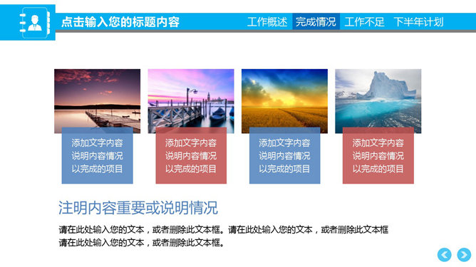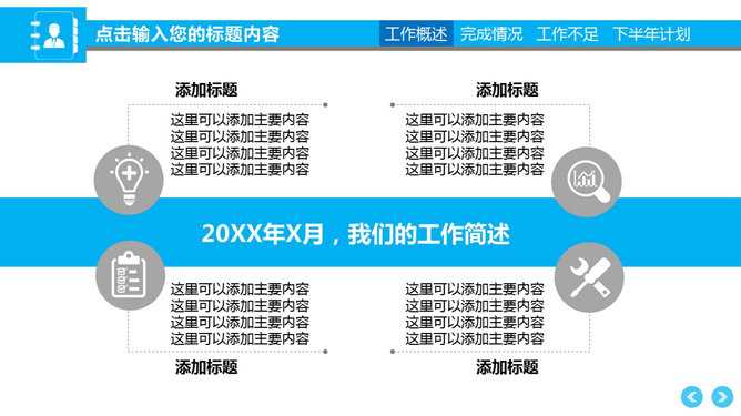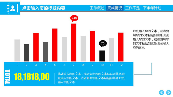 大气年中工作总结方案PPT模板。一份半年年中工作总结方案陈述幻灯片模板,简练大气动态效果,更多同类模板请参阅:工作陈述PPT模板。