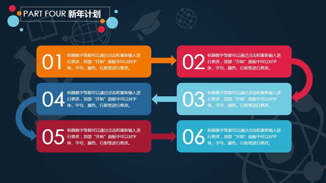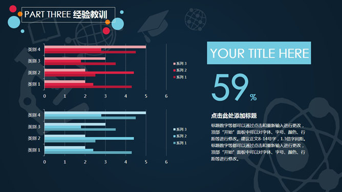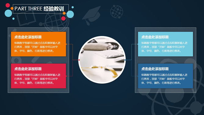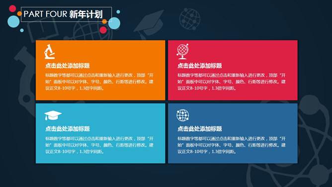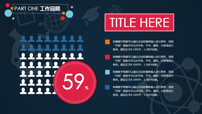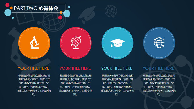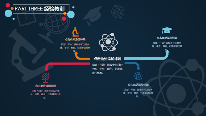 教师学校工作总结汇报PPT模板。一份教育职业主题幻灯片模板,带有显微镜、地球仪、书本、博士帽图画的深蓝背景,多彩配色,动态演示作用。合适教师教师或学校工作总结报告使用。