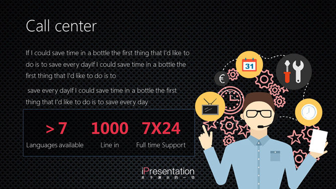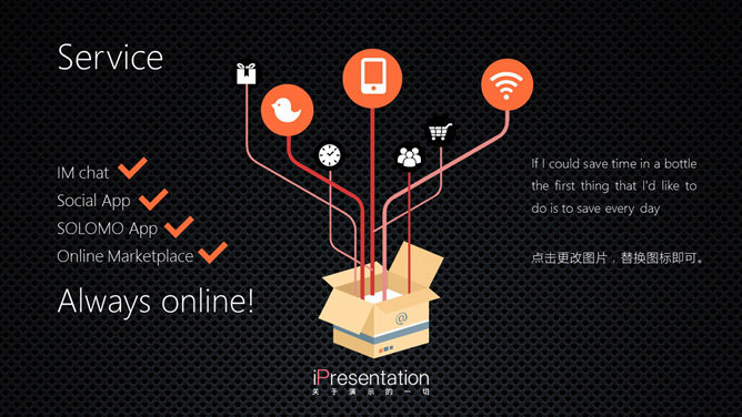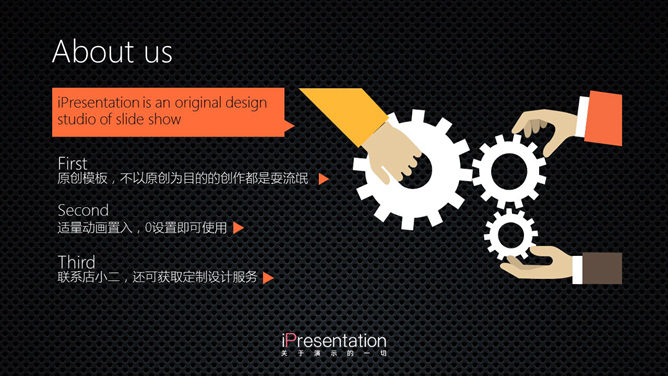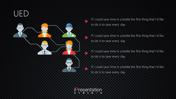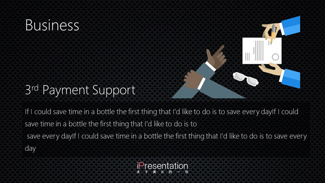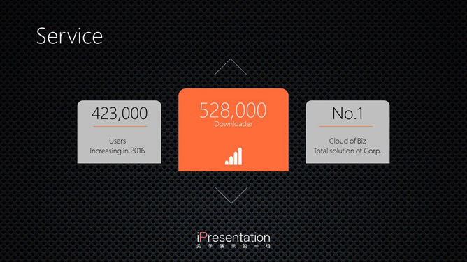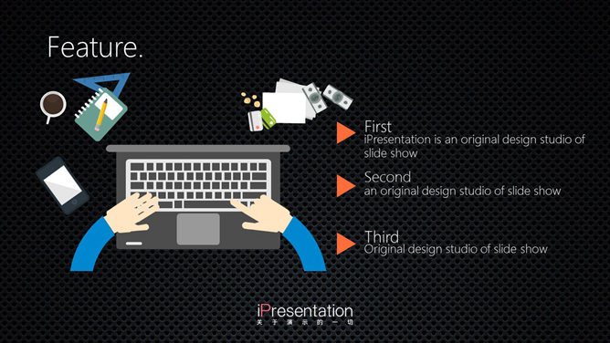 酷黑扁平化矢量商务PPT模板。一份矢量扁平化商务风格幻灯片模板,质感黑色网面布景,纯手绘矢量元素。