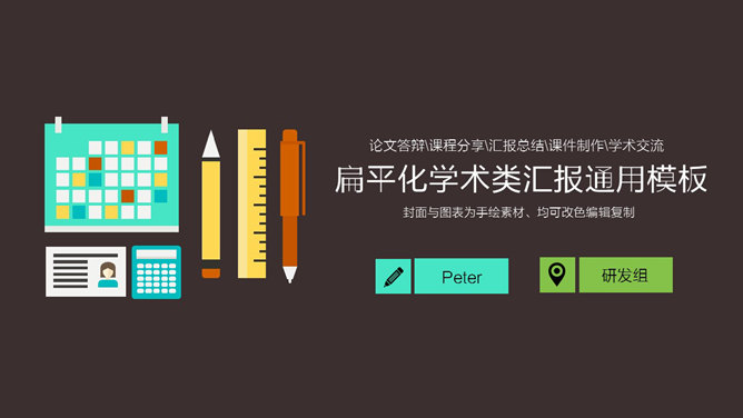 扁平化学术陈述陈述PPT模板。一份强大的学术陈述陈述幻灯片模板,矢量扁平化设计风格,五颜六色配色,共36页,页面类型丰厚,适合开题陈述、结业论文答辩等用途。