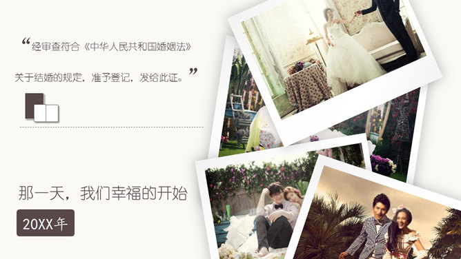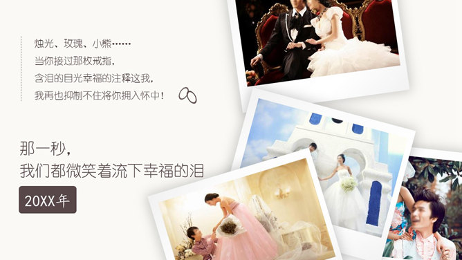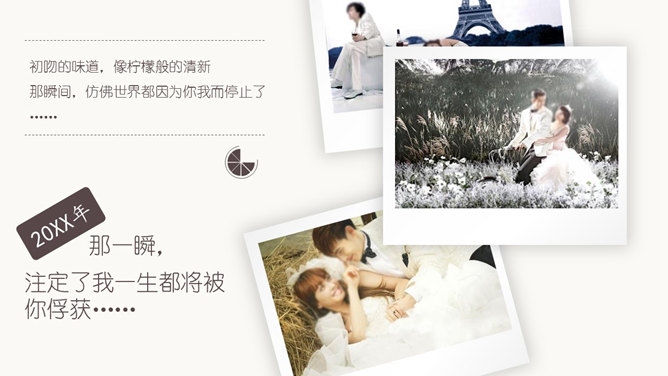 动态浪漫婚纱照相册PPT模板。一份婚纱照相册幻灯片模板,适合婚礼上的相片展示。使用字体:幼圆、Kunstler Script。
