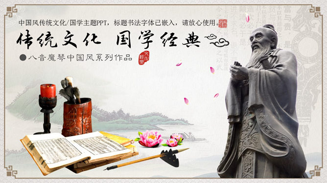 传统文化孔子国学培训PPT模板。一份精巧中国风幻灯片模板,以孔子塑像为封面布景,共36页,页面类型丰厚,美丽的动态效果,适合中国传统文化介绍、国学培训等用途。所用字体:方正字迹-吕建德字体、方正隶变简体、华康俪金黑W8(P)。