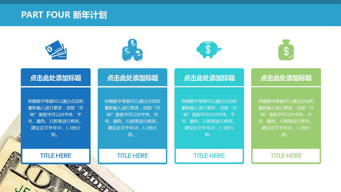 财政财会工作总结报告PPT模板。一份适合财政工作人员工作报告总结运用的幻灯片模板,扁平化规划风格,动态切换,运用金币、货币符号、美元等金融货币相关的元素规划。