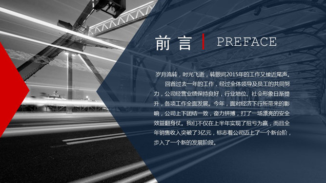 大气动态工作总结PPT模板。一份大方商务风格工作汇报总结幻灯片模板,以高速公路为布景,象征高速发展,共28页,动态演示作用,丰厚的图形图表页面。