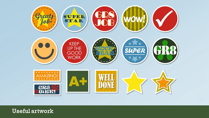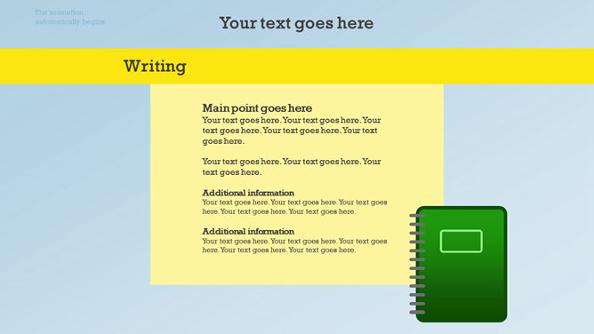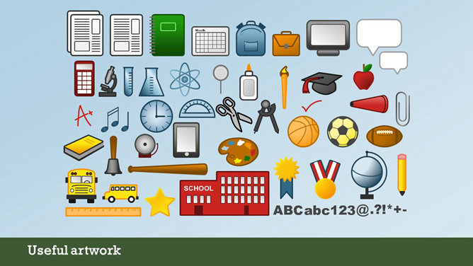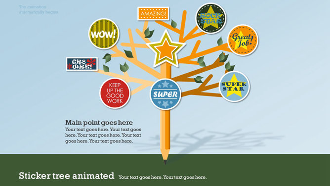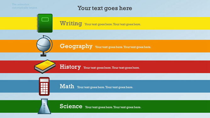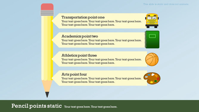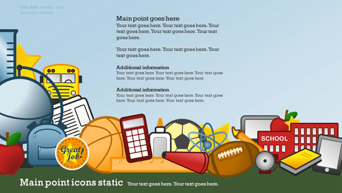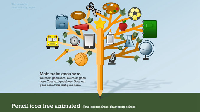 一份创意学校学生教育相关PPT模板,矢量扁平化风格,以足球、篮球、笔记本、地球仪、校车、画笔画板等学校元素规划,动态铅笔树成长展开作用,另有多种图标资料。