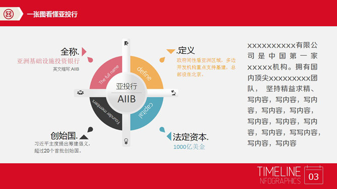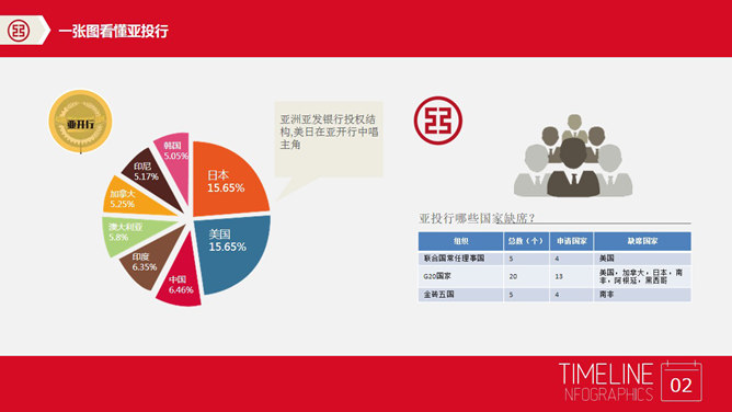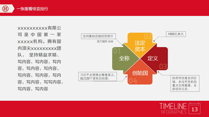 亚投行介绍PPT模板下载。一份合适用来介绍简介亚投行(亚洲投资银行)的幻灯片模板,首页以宏伟大气的石狮子为背景,赤色主色调。所用字体:张海山锐谐体、方正正准黑简体。