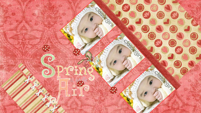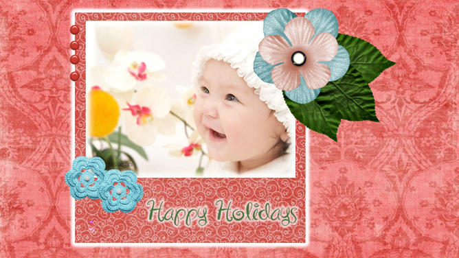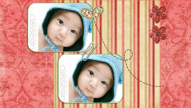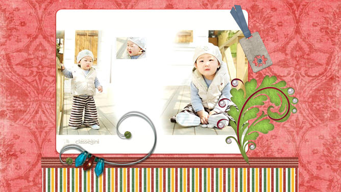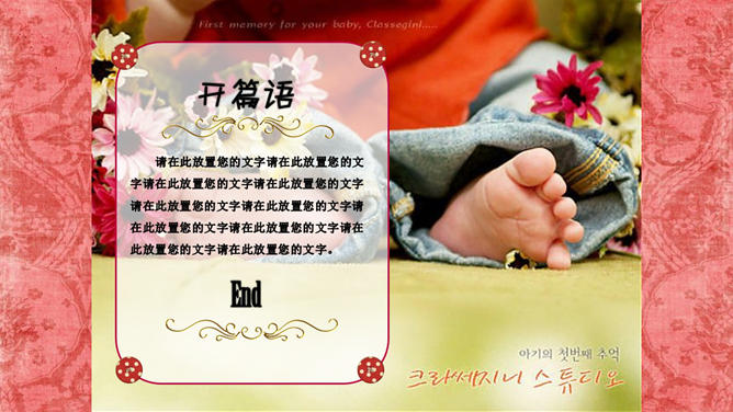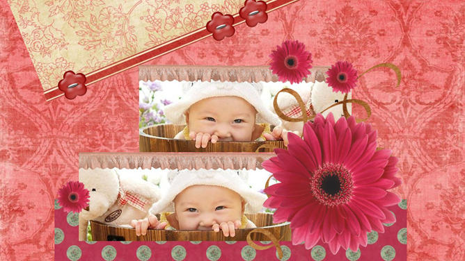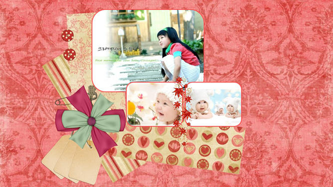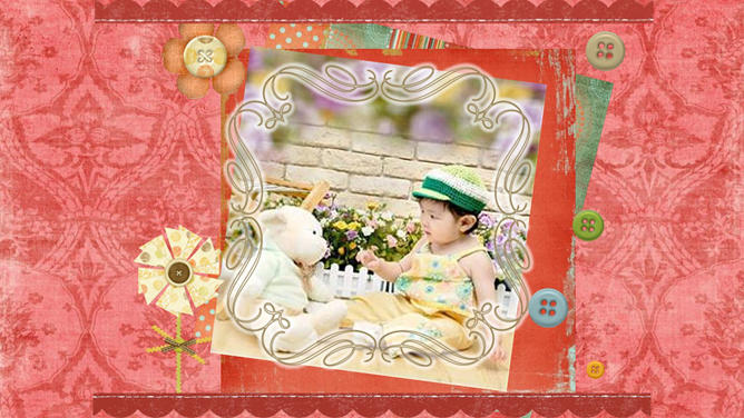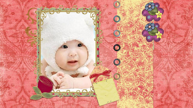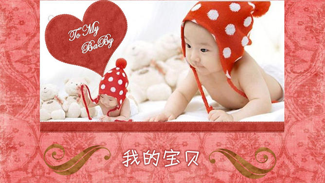 宝贝婴儿儿童相册PPT模板。红色花纹布纹纹理布景,心爱爱心花朵蝴蝶等装饰,主张装置字体:汉仪丫丫体简、Edwardian Script ITC。