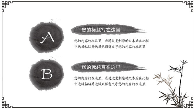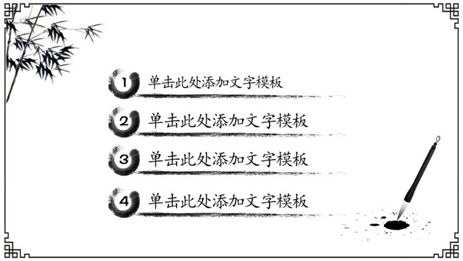 简约动态水墨中国风PPT模板。一份精美的水墨中国风幻灯片模板,古典纹路边框,毛笔墨迹作用设计,共31页,页面丰厚齐全,动态演示作用,使用字体:方正吕建德字体、方正隶二简体、方正宋黑简体、方正古隶简体、方正华隶简体。