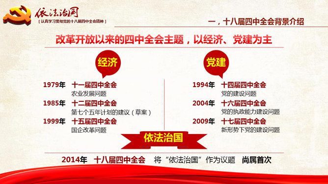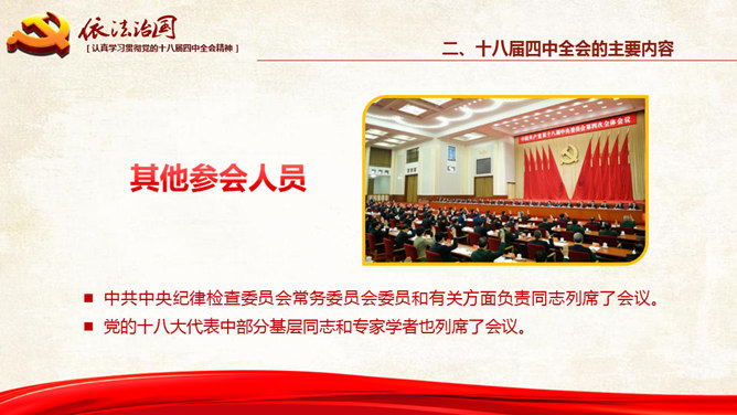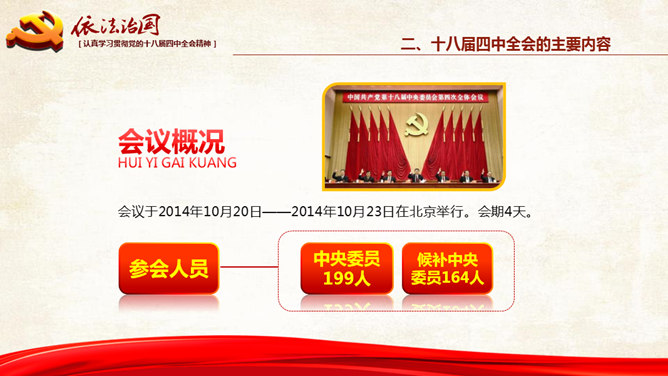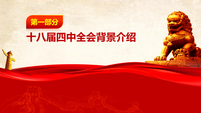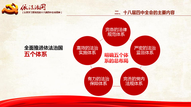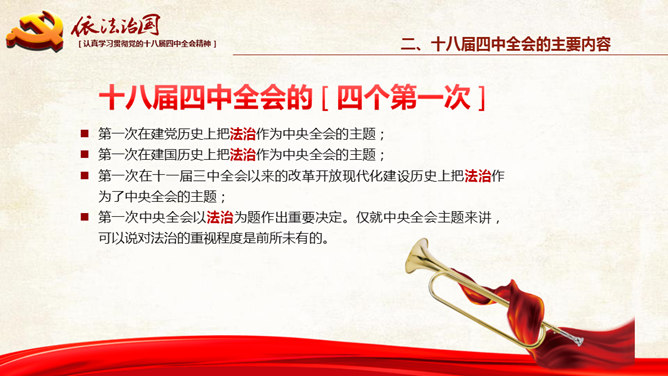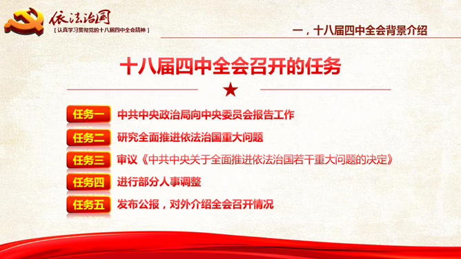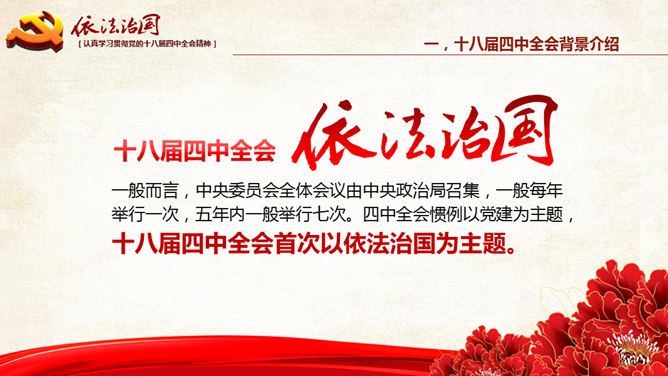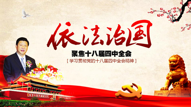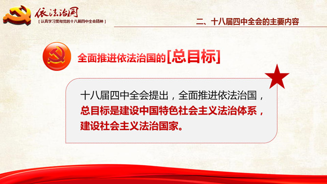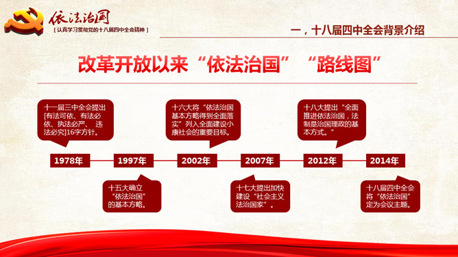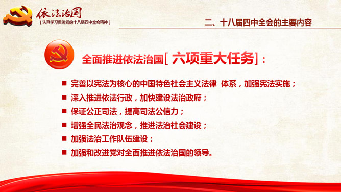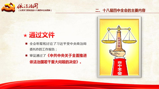 十八大依法治国PPT模板。一份设计精美的依法治国主题幻灯片模板,大气红色主色调,共54页,内容专业丰富。
