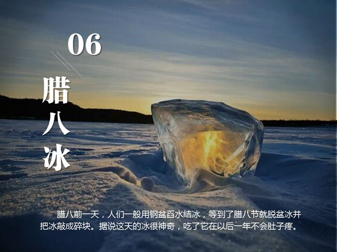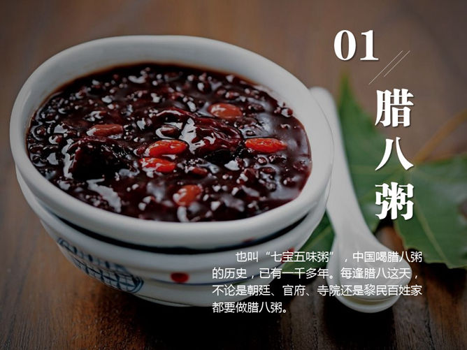 腊八节美食介绍PPT作品。腊八节,俗称“腊八” ,即农历十二月初八,古人有祭祀祖先神灵、请求丰盈吉祥的传统。本作品介绍了风俗这天吃的食物,例如腊八粥、腊八蒜、腊八面等,好看的高清大图布景。