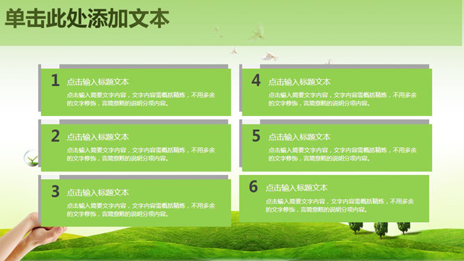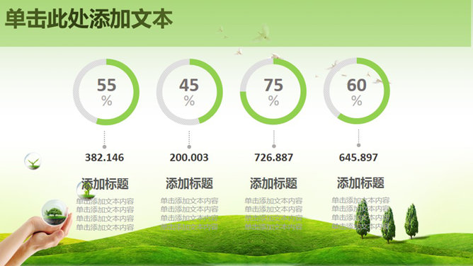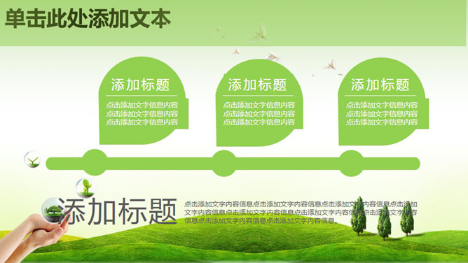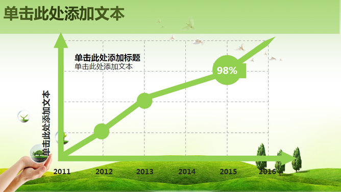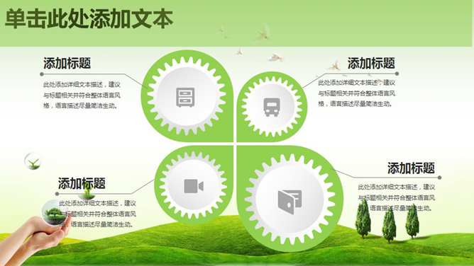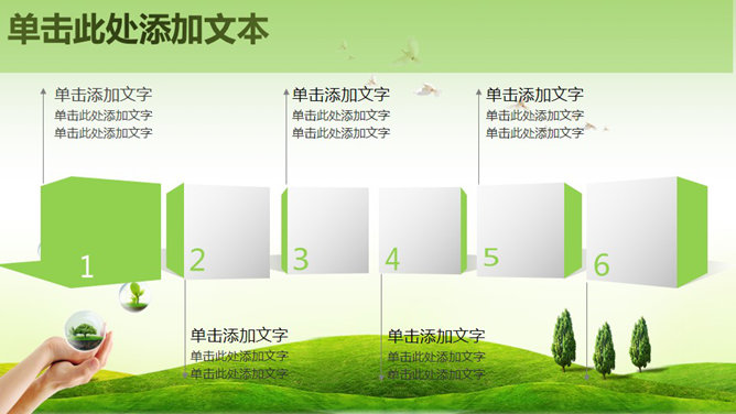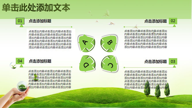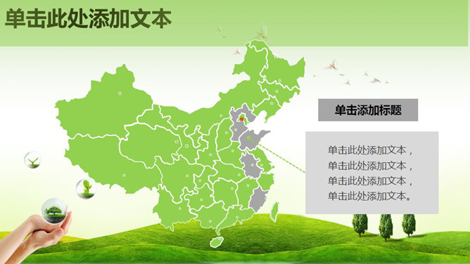 一份超强绿色环保环境保护PPT模板,以草地和手捧心形绿树为布景,象征爱护天然保护环境,绿色主色调,共35页,此处仅部分展示,页面种类非常多,挑选面广,动态播放作用,一份可贵的精品。