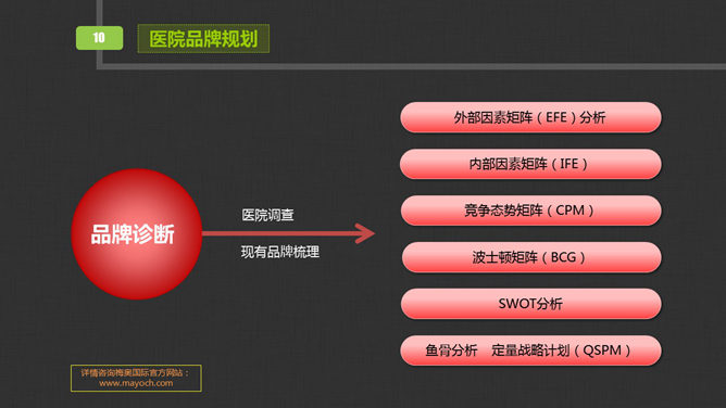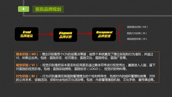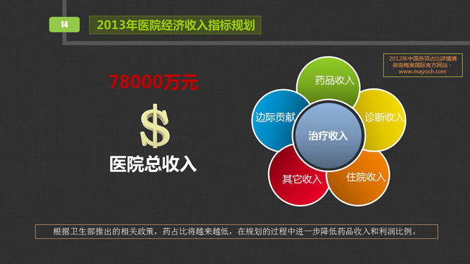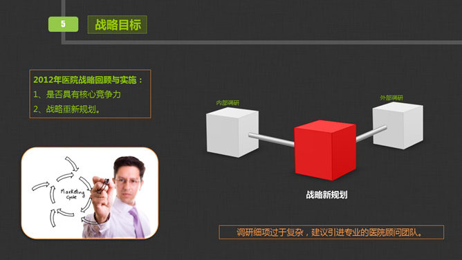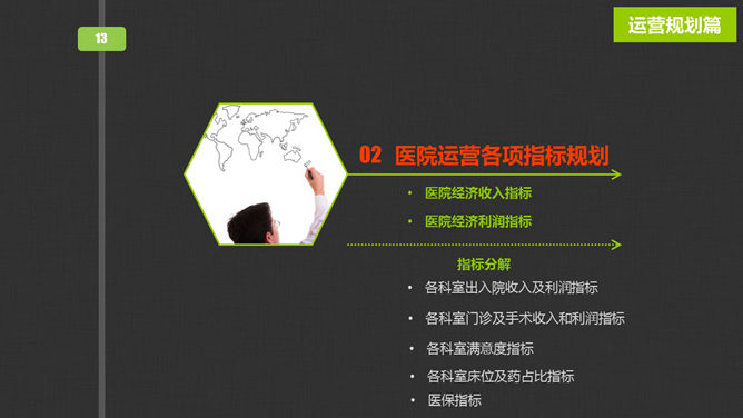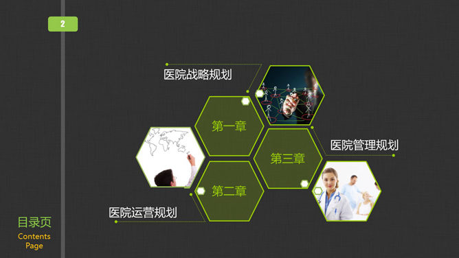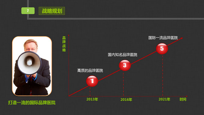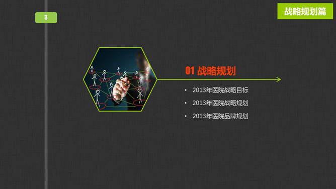 一份强壮医院、医疗机构合适运用的工作汇报总结PPT模板,动态效果,包括战略规划、办理规划和运营规划三个部分。