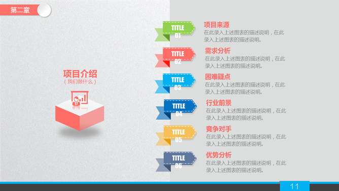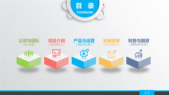 商业项目融资计划书PPT模板。一套商业创业项目融资计划书幻灯片模板,微立体设计风格,质感灰色布景,多彩配色。