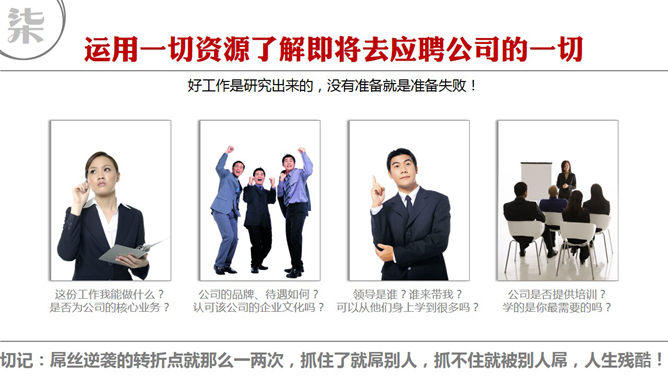 关于找工作的十个忠告:首先认清你要找的终究是什么。正确认识所谓的抢手和高薪。正确理解想做和能做。正确理解就业和创业。正确看待所谓的饭碗。好好制作你的简历。运用一切资源了解即将去应聘公司的一切…