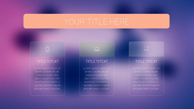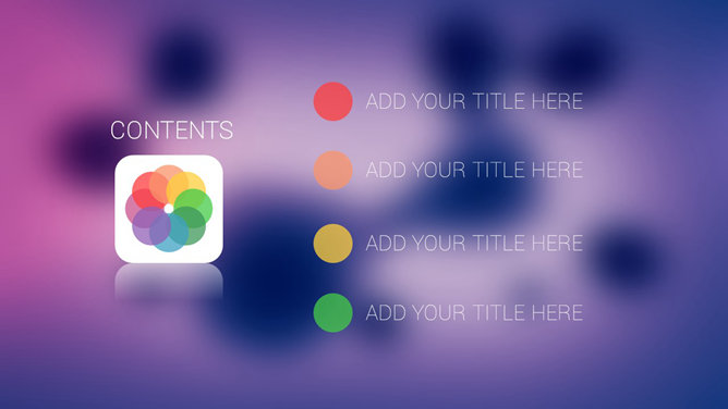 IOS风格色彩艳丽的PPT模板,采用虚化作用布景,半透明文本框,淡入淡出页面切换,关键词:好看的PPT模板下载。运用英文字体:GillSans Light、Roboto-Thin。