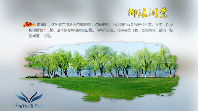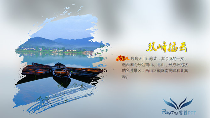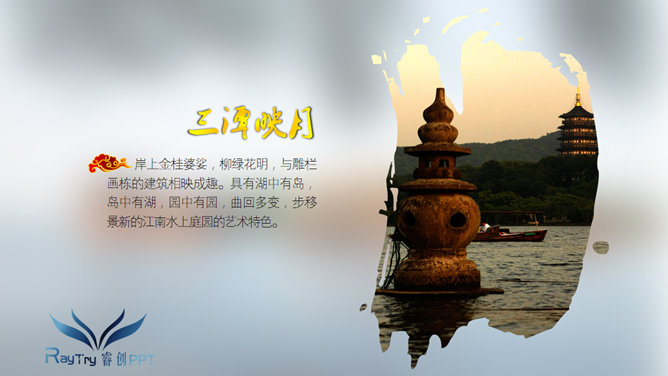 一份介绍西湖十大旅游景点的PPT,哪十大景点?苏堤春晓、曲院风荷、平湖秋月、断桥残雪、柳浪闻莺、花港观鱼等。