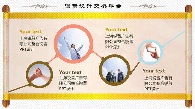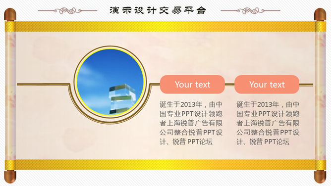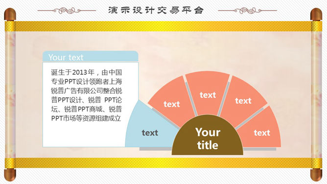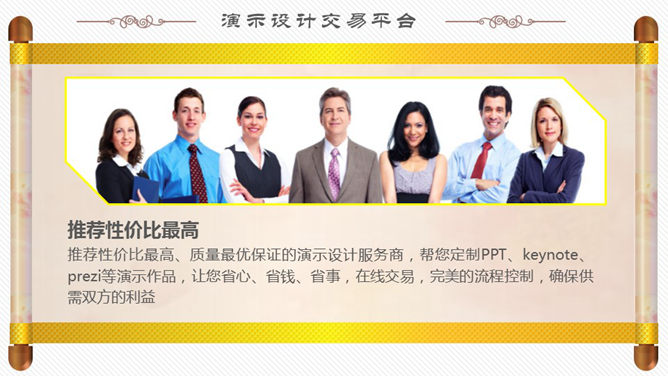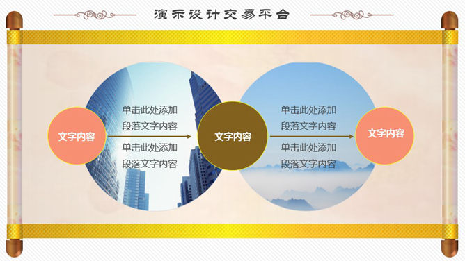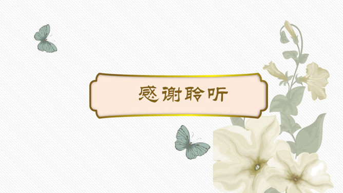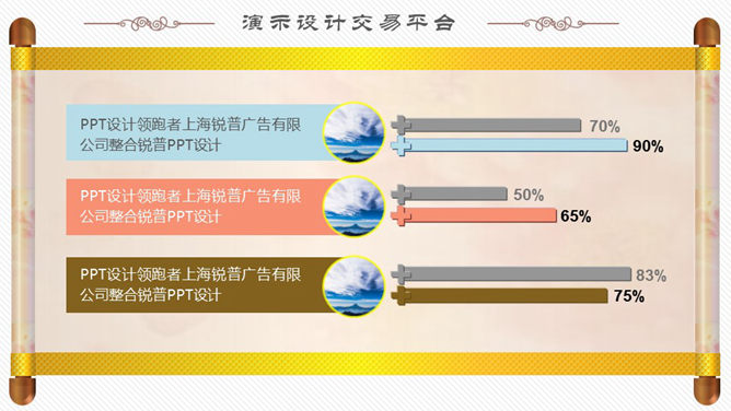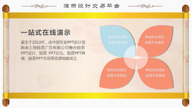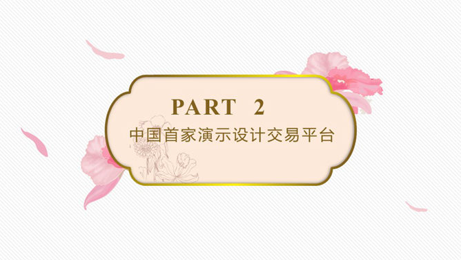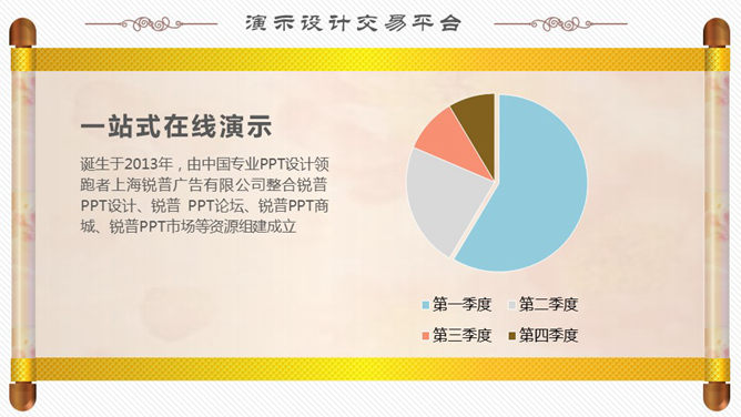 一份精美的古典风格PPT模板,首页以华贵的古典花朵为布景,内页选用展开的卷轴规划,包括多种图形图表。使用字体:隶书、Engravers MT。